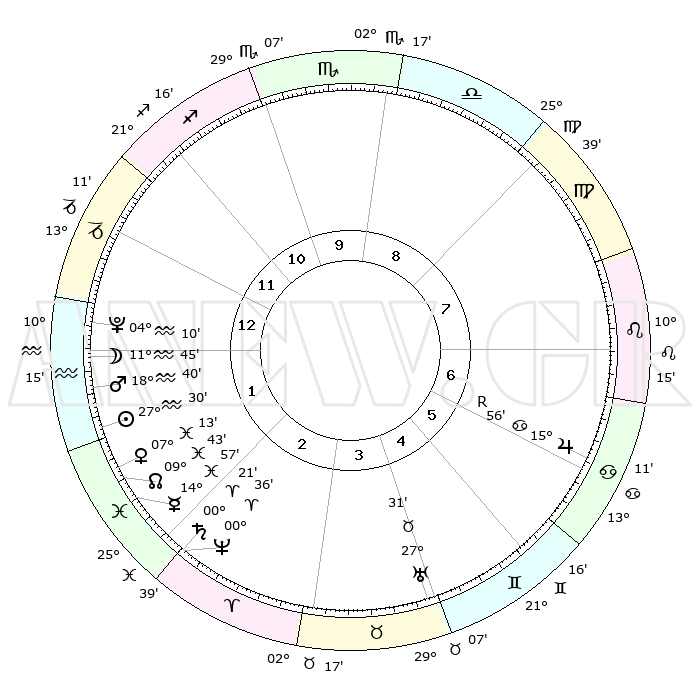| | ΘΕΣΕΙΣ ΠΛΑΝΗΤΩΝ ΑΣΤΡΟΛΟΓΙΚΟΥ ΧΑΡΤΗ ΤΗΣ ΣΤΙΓΜΗΣ ΑΥΤΗΣ | | | | Πλανήτης | Ζώδιο | Μοίρες | Δεκαήμ. | Σε οίκο | Απόκλιση | | Ακμές των οίκων | | Ηλιος | Υδροχόος | 27°22' | Τρίτο | 2 | 12 S 23 | | 1ος | 20°14' | Τοξότης | | Σελήνη | Υδροχόος | 10°02' | Δεύτερο | 2 | 20 S 11 | | 2ος | 25°02' | Αιγόκερως | | Ερμής | Ιχθείς | 14°46' | Δεύτερο | 3 | 05 S 44 | | 3ος | 04°01' | Ιχθείς | | Αφροδίτη | Ιχθείς | 07°03' | Πρώτο | 3 | 10 S 17 | | 4ος | 09°16' | Κριός | | Αρης | Υδροχόος | 18°33' | Δεύτερο | 2 | 16 S 17 | | 5ος | 07°12' | Ταύρος | | Δίας | Καρκίνος | 15°57'R | Δεύτερο | 7 | 22 N 48 | | 6ος | 29°48' | Ταύρος | | Κρόνος | Κριός | 00°21' | Πρώτο | 3 | 01 S 50 | | 7ος | 20°14' | Δίδυμοι | | Ουρανός | Ταύρος | 27°31' | Τρίτο | 5 | 19 N 25 | | 8ος | 25°02' | Καρκίνος | | Ποσειδώνας | Κριός | 00°36' | Πρώτο | 3 | 00 S 58 | | 9ος | 04°01' | Παρθένος | | Πλούτωνας | Υδροχόος | 04°10' | Πρώτο | 2 | 22 S 56 | | 10ος | 09°16' | Ζυγός | | Β. Δεσμός | Ιχθείς | 09°44' | Πρώτο | 3 | 07 S 55 | | 11ος | 07°12' | Σκορπιός | | Ωροσκόπος | Τοξότης | 20°14' | Τρίτο | | | 12ος | 29°48' | Σκορπιός | | Μεσουράνημα | Ζυγός | 09°16' | Πρώτο | | | |