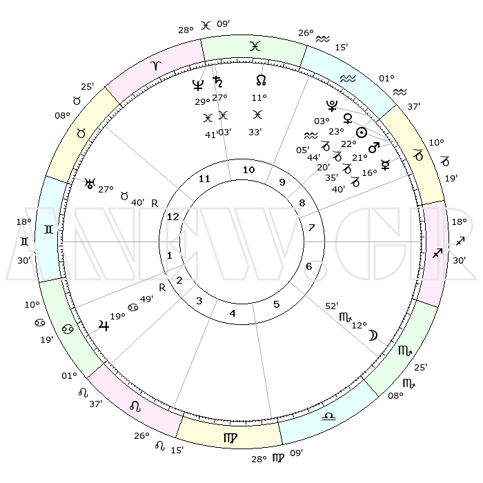 | | ΘΕΣΕΙΣ ΠΛΑΝΗΤΩΝ ΑΣΤΡΟΛΟΓΙΚΟΥ ΧΑΡΤΗ ΤΗΣ ΣΤΙΓΜΗΣ ΑΥΤΗΣ | | | | Πλανήτης | Ζώδιο | Μοίρες | Δεκαήμ. | Σε οίκο | Απόκλιση | | Ακμές των οίκων | | Ηλιος | Αιγόκερως | 22°12' | Τρίτο | 10 | 21 S 36 | | 1ος | 19°09' | Κριός | | Σελήνη | Σκορπιός | 11°20' | Δεύτερο | 7 | 19 S 29 | | 2ος | 24°24' | Ταύρος | | Ερμής | Αιγόκερως | 16°28' | Δεύτερο | 10 | 24 S 01 | | 3ος | 19°10' | Δίδυμοι | | Αφροδίτη | Αιγόκερως | 23°34' | Τρίτο | 10 | 22 S 16 | | 4ος | 10°55' | Καρκίνος | | Αρης | Αιγόκερως | 21°29' | Τρίτο | 10 | 22 S 40 | | 5ος | 04°22' | Λέων | | Δίας | Καρκίνος | 19°50'R | Δεύτερο | 4 | 22 N 14 | | 6ος | 05°00' | Παρθένος | | Κρόνος | Ιχθείς | 27°03' | Τρίτο | 12 | 03 S 13 | | 7ος | 19°09' | Ζυγός | | Ουρανός | Ταύρος | 27°41'R | Τρίτο | 2 | 19 N 27 | | 8ος | 24°24' | Σκορπιός | | Ποσειδώνας | Ιχθείς | 29°41' | Τρίτο | 12 | 01 S 20 | | 9ος | 19°10' | Τοξότης | | Πλούτωνας | Υδροχόος | 03°05' | Πρώτο | 10 | 23 S 09 | | 10ος | 10°55' | Αιγόκερως | | Β. Δεσμός | Ιχθείς | 11°34' | Δεύτερο | 12 | 07 S 13 | | 11ος | 04°22' | Υδροχόος | | Ωροσκόπος | Κριός | 19°09' | Δεύτερο | | | 12ος | 05°00' | Ιχθείς | | Μεσουράνημα | Αιγόκερως | 10°55' | Δεύτερο | | | |