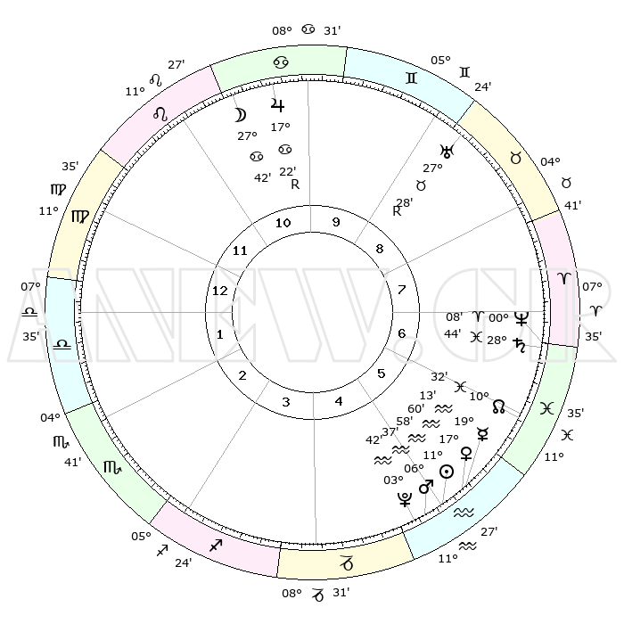 | | ΘΕΣΕΙΣ ΠΛΑΝΗΤΩΝ ΑΣΤΡΟΛΟΓΙΚΟΥ ΧΑΡΤΗ ΤΗΣ ΣΤΙΓΜΗΣ ΑΥΤΗΣ | | | | Πλανήτης | Ζώδιο | Μοίρες | Δεκαήμ. | Σε οίκο | Απόκλιση | | Ακμές των οίκων | | Ηλιος | Υδροχόος | 11°54' | Δεύτερο | 5 | 17 S 13 | | 1ος | 18°20' | Παρθένος | | Σελήνη | Καρκίνος | 26°46' | Τρίτο | 11 | 24 N 15 | | 2ος | 13°59' | Ζυγός | | Ερμής | Υδροχόος | 19°06' | Δεύτερο | 5 | 16 S 54 | | 3ος | 13°55' | Σκορπιός | | Αφροδίτη | Υδροχόος | 17°55' | Δεύτερο | 5 | 16 S 45 | | 4ος | 16°51' | Τοξότης | | Αρης | Υδροχόος | 06°34' | Πρώτο | 5 | 19 S 38 | | 5ος | 20°05' | Αιγόκερως | | Δίας | Καρκίνος | 17°23'R | Δεύτερο | 10 | 22 N 36 | | 6ος | 20°59' | Υδροχόος | | Κρόνος | Ιχθείς | 28°44' | Τρίτο | 7 | 02 S 30 | | 7ος | 18°20' | Ιχθείς | | Ουρανός | Ταύρος | 27°28'R | Τρίτο | 9 | 19 N 24 | | 8ος | 13°59' | Κριός | | Ποσειδώνας | Κριός | 00°08' | Πρώτο | 7 | 01 S 09 | | 9ος | 13°55' | Ταύρος | | Πλούτωνας | Υδροχόος | 03°42' | Πρώτο | 5 | 23 S 01 | | 10ος | 16°51' | Δίδυμοι | | Β. Δεσμός | Ιχθείς | 10°32' | Δεύτερο | 6 | 07 S 37 | | 11ος | 20°05' | Καρκίνος | | Ωροσκόπος | Παρθένος | 18°20' | Δεύτερο | | | 12ος | 20°59' | Λέων | | Μεσουράνημα | Δίδυμοι | 16°51' | Δεύτερο | | | |