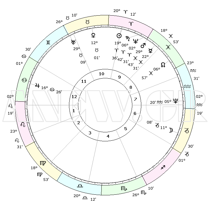 | | ΘΕΣΕΙΣ ΠΛΑΝΗΤΩΝ ΑΣΤΡΟΛΟΓΙΚΟΥ ΧΑΡΤΗ ΤΗΣ ΣΤΙΓΜΗΣ ΑΥΤΗΣ | | | | Πλανήτης | Ζώδιο | Μοίρες | Δεκαήμ. | Σε οίκο | Απόκλιση | | Ακμές των οίκων | | Ηλιος | Κριός | 19°32' | Δεύτερο | 10 | 07 N 38 | | 1ος | 13°43' | Καρκίνος | | Σελήνη | Αιγόκερως | 10°23' | Δεύτερο | 6 | 27 S 23 | | 2ος | 04°08' | Λέων | | Ερμής | Ιχθείς | 22°26' | Τρίτο | 9 | 05 S 06 | | 3ος | 27°08' | Λέων | | Αφροδίτη | Ταύρος | 11°56' | Δεύτερο | 11 | 15 N 20 | | 4ος | 25°44' | Παρθένος | | Αρης | Ιχθείς | 29°40' | Τρίτο | 10 | 01 S 04 | | 5ος | 01°21' | Σκορπιός | | Δίας | Καρκίνος | 16°26' | Δεύτερο | 1 | 22 N 48 | | 6ος | 09°46' | Τοξότης | | Κρόνος | Κριός | 06°42' | Πρώτο | 10 | 00 N 42 | | 7ος | 13°43' | Αιγόκερως | | Ουρανός | Ταύρος | 29°09' | Τρίτο | 11 | 19 N 48 | | 8ος | 04°08' | Υδροχόος | | Ποσειδώνας | Κριός | 02°31' | Πρώτο | 10 | 00 S 12 | | 9ος | 27°08' | Υδροχόος | | Πλούτωνας | Υδροχόος | 05°20' | Πρώτο | 8 | 22 S 47 | | 10ος | 25°44' | Ιχθείς | | Β. Δεσμός | Ιχθείς | 06°58' | Πρώτο | 9 | 08 S 57 | | 11ος | 01°21' | Ταύρος | | Ωροσκόπος | Καρκίνος | 13°43' | Δεύτερο | | | 12ος | 09°46' | Δίδυμοι | | Μεσουράνημα | Ιχθείς | 25°44' | Τρίτο | | | |