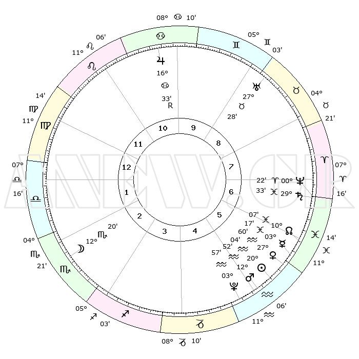 | | ΘΕΣΕΙΣ ΠΛΑΝΗΤΩΝ ΑΣΤΡΟΛΟΓΙΚΟΥ ΧΑΡΤΗ ΤΗΣ ΣΤΙΓΜΗΣ ΑΥΤΗΣ | | | | Πλανήτης | Ζώδιο | Μοίρες | Δεκαήμ. | Σε οίκο | Απόκλιση | | Ακμές των οίκων | | Ηλιος | Υδροχόος | 19°59' | Δεύτερο | 6 | 14 S 49 | | 1ος | 14°08' | Παρθένος | | Σελήνη | Σκορπιός | 11°24' | Δεύτερο | 3 | 19 S 40 | | 2ος | 09°24' | Ζυγός | | Ερμής | Ιχθείς | 03°08' | Πρώτο | 6 | 11 S 22 | | 3ος | 09°07' | Σκορπιός | | Αφροδίτη | Υδροχόος | 27°54' | Τρίτο | 6 | 13 S 33 | | 4ος | 12°03' | Τοξότης | | Αρης | Υδροχόος | 12°49' | Δεύτερο | 5 | 17 S 59 | | 5ος | 15°27' | Αιγόκερως | | Δίας | Καρκίνος | 16°34'R | Δεύτερο | 11 | 22 N 43 | | 6ος | 16°32' | Υδροχόος | | Κρόνος | Ιχθείς | 29°33' | Τρίτο | 7 | 02 S 10 | | 7ος | 14°08' | Ιχθείς | | Ουρανός | Ταύρος | 27°28' | Τρίτο | 9 | 19 N 24 | | 8ος | 09°24' | Κριός | | Ποσειδώνας | Κριός | 00°22' | Πρώτο | 7 | 01 S 03 | | 9ος | 09°07' | Ταύρος | | Πλούτωνας | Υδροχόος | 03°57' | Πρώτο | 5 | 22 S 59 | | 10ος | 12°03' | Δίδυμοι | | Β. Δεσμός | Ιχθείς | 10°07' | Δεύτερο | 6 | 07 S 46 | | 11ος | 15°27' | Καρκίνος | | Ωροσκόπος | Παρθένος | 14°08' | Δεύτερο | | | 12ος | 16°32' | Λέων | | Μεσουράνημα | Δίδυμοι | 12°03' | Δεύτερο | | | |