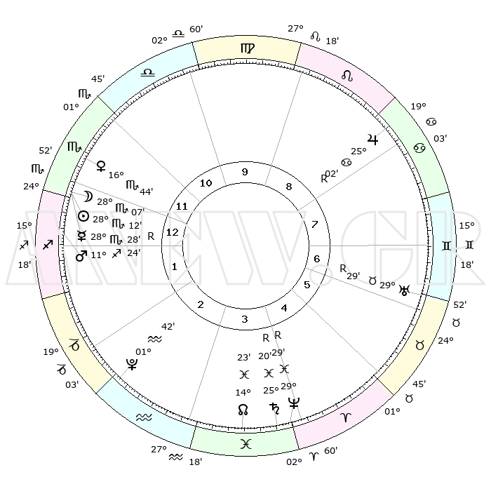 | | ΘΕΣΕΙΣ ΠΛΑΝΗΤΩΝ ΑΣΤΡΟΛΟΓΙΚΟΥ ΧΑΡΤΗ ΤΗΣ ΣΤΙΓΜΗΣ ΑΥΤΗΣ | | | | Πλανήτης | Ζώδιο | Μοίρες | Δεκαήμ. | Σε οίκο | Απόκλιση | | Ακμές των οίκων | | Ηλιος | Σκορπιός | 28°08' | Τρίτο | 1 | 19 S 44 | | 1ος | 26°20' | Σκορπιός | | Σελήνη | Σκορπιός | 27°22' | Τρίτο | 1 | 24 S 12 | | 2ος | 26°59' | Τοξότης | | Ερμής | Σκορπιός | 28°33'R | Τρίτο | 1 | 19 S 22 | | 3ος | 02°06' | Υδροχόος | | Αφροδίτη | Σκορπιός | 16°39' | Δεύτερο | 12 | 15 S 47 | | 4ος | 08°01' | Ιχθείς | | Αρης | Τοξότης | 11°21' | Δεύτερο | 1 | 22 S 42 | | 5ος | 09°29' | Κριός | | Δίας | Καρκίνος | 25°02'R | Τρίτο | 8 | 21 N 15 | | 6ος | 05°02' | Ταύρος | | Κρόνος | Ιχθείς | 25°20'R | Τρίτο | 4 | 04 S 04 | | 7ος | 26°20' | Ταύρος | | Ουρανός | Ταύρος | 29°30'R | Τρίτο | 7 | 19 N 50 | | 8ος | 26°59' | Δίδυμοι | | Ποσειδώνας | Ιχθείς | 29°29'R | Τρίτο | 4 | 01 S 27 | | 9ος | 02°06' | Λέων | | Πλούτωνας | Υδροχόος | 01°42' | Πρώτο | 2 | 23 S 27 | | 10ος | 08°02' | Παρθένος | | Β. Δεσμός | Ιχθείς | 14°23' | Δεύτερο | 4 | 06 S 09 | | 11ος | 09°29' | Ζυγός | | Ωροσκόπος | Σκορπιός | 26°20' | Τρίτο | | | 12ος | 05°02' | Σκορπιός | | Μεσουράνημα | Παρθένος | 08°02' | Πρώτο | | | |