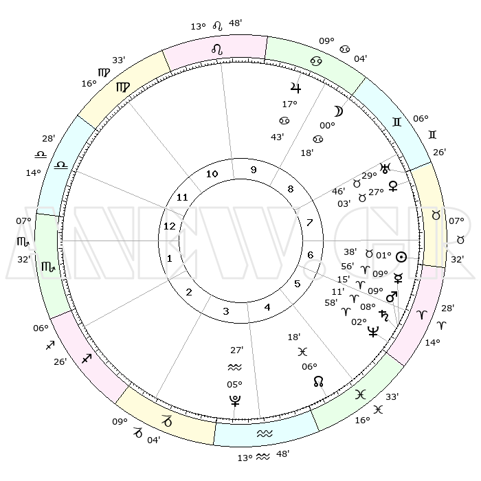 | | ΘΕΣΕΙΣ ΠΛΑΝΗΤΩΝ ΑΣΤΡΟΛΟΓΙΚΟΥ ΧΑΡΤΗ ΤΗΣ ΣΤΙΓΜΗΣ ΑΥΤΗΣ | | | | Πλανήτης | Ζώδιο | Μοίρες | Δεκαήμ. | Σε οίκο | Απόκλιση | | Ακμές των οίκων | | Ηλιος | Ταύρος | 01°34' | Πρώτο | 7 | 12 N 01 | | 1ος | 18°43' | Ζυγός | | Σελήνη | Δίδυμοι | 29°22' | Τρίτο | 9 | 28 N 10 | | 2ος | 16°29' | Σκορπιός | | Ερμής | Κριός | 09°49' | Πρώτο | 6 | 01 N 31 | | 3ος | 17°42' | Τοξότης | | Αφροδίτη | Ταύρος | 26°58' | Τρίτο | 8 | 19 N 56 | | 4ος | 21°14' | Αιγόκερως | | Αρης | Κριός | 09°12' | Πρώτο | 6 | 02 N 47 | | 5ος | 24°11' | Υδροχόος | | Δίας | Καρκίνος | 17°42' | Δεύτερο | 9 | 22 N 39 | | 6ος | 23°43' | Ιχθείς | | Κρόνος | Κριός | 08°11' | Πρώτο | 6 | 01 N 16 | | 7ος | 18°43' | Κριός | | Ουρανός | Ταύρος | 29°46' | Τρίτο | 8 | 19 N 56 | | 8ος | 16°29' | Ταύρος | | Ποσειδώνας | Κριός | 02°57' | Πρώτο | 6 | 00 S 02 | | 9ος | 17°42' | Δίδυμοι | | Πλούτωνας | Υδροχόος | 05°27' | Πρώτο | 4 | 22 S 48 | | 10ος | 21°14' | Καρκίνος | | Β. Δεσμός | Ιχθείς | 06°19' | Πρώτο | 5 | 09 S 12 | | 11ος | 24°11' | Λέων | | Ωροσκόπος | Ζυγός | 18°43' | Δεύτερο | | | 12ος | 23°43' | Παρθένος | | Μεσουράνημα | Καρκίνος | 21°14' | Τρίτο | | | |