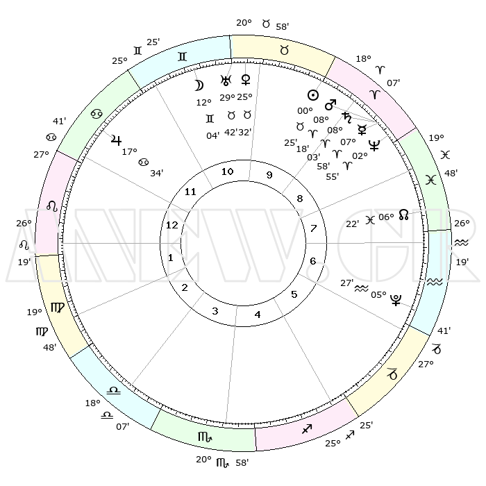 | | ΘΕΣΕΙΣ ΠΛΑΝΗΤΩΝ ΑΣΤΡΟΛΟΓΙΚΟΥ ΧΑΡΤΗ ΤΗΣ ΣΤΙΓΜΗΣ ΑΥΤΗΣ | | | | Πλανήτης | Ζώδιο | Μοίρες | Δεκαήμ. | Σε οίκο | Απόκλιση | | Ακμές των οίκων | | Ηλιος | Ταύρος | 00°22' | Πρώτο | 9 | 11 N 36 | | 1ος | 10°26' | Λέων | | Σελήνη | Δίδυμοι | 11°15' | Δεύτερο | 11 | 27 N 10 | | 2ος | 02°18' | Παρθένος | | Ερμής | Κριός | 07°53' | Πρώτο | 9 | 00 N 43 | | 3ος | 28°46' | Παρθένος | | Αφροδίτη | Ταύρος | 25°28' | Τρίτο | 10 | 19 N 32 | | 4ος | 00°52' | Σκορπιός | | Αρης | Κριός | 08°15' | Πρώτο | 9 | 02 N 24 | | 5ος | 06°26' | Τοξότης | | Δίας | Καρκίνος | 17°34' | Δεύτερο | 12 | 22 N 40 | | 6ος | 10°32' | Αιγόκερως | | Κρόνος | Κριός | 08°02' | Πρώτο | 9 | 01 N 13 | | 7ος | 10°26' | Υδροχόος | | Ουρανός | Ταύρος | 29°42' | Τρίτο | 10 | 19 N 55 | | 8ος | 02°18' | Ιχθείς | | Ποσειδώνας | Κριός | 02°55' | Πρώτο | 9 | 00 S 03 | | 9ος | 28°46' | Ιχθείς | | Πλούτωνας | Υδροχόος | 05°27' | Πρώτο | 6 | 22 S 48 | | 10ος | 00°52' | Ταύρος | | Β. Δεσμός | Ιχθείς | 06°22' | Πρώτο | 8 | 09 S 10 | | 11ος | 06°26' | Δίδυμοι | | Ωροσκόπος | Λέων | 10°26' | Δεύτερο | | | 12ος | 10°32' | Καρκίνος | | Μεσουράνημα | Ταύρος | 00°52' | Πρώτο | | | |