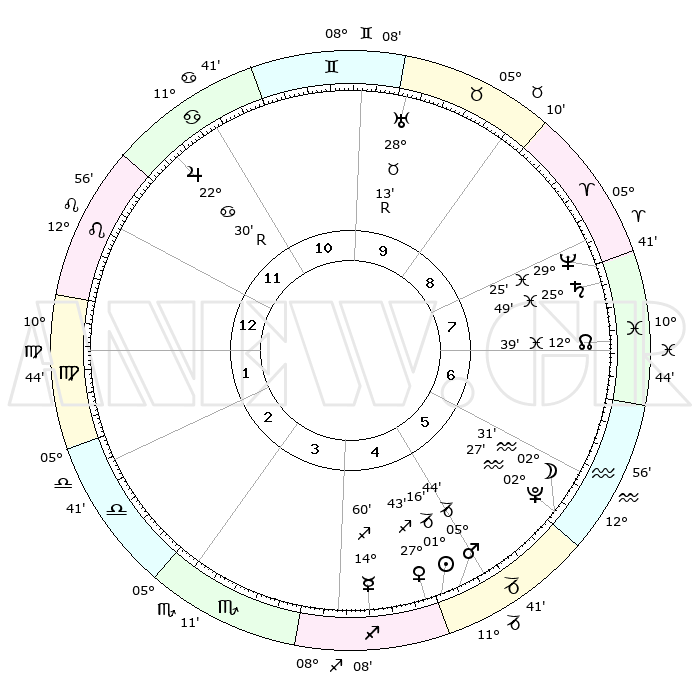 | | ΘΕΣΕΙΣ ΠΛΑΝΗΤΩΝ ΑΣΤΡΟΛΟΓΙΚΟΥ ΧΑΡΤΗ ΤΗΣ ΣΤΙΓΜΗΣ ΑΥΤΗΣ | | | | Πλανήτης | Ζώδιο | Μοίρες | Δεκαήμ. | Σε οίκο | Απόκλιση | | Ακμές των οίκων | | Ηλιος | Αιγόκερως | 01°11' | Πρώτο | 5 | 23 S 26 | | 1ος | 18°30' | Λέων | | Σελήνη | Υδροχόος | 01°34' | Πρώτο | 6 | 22 S 57 | | 2ος | 11°09' | Παρθένος | | Ερμής | Τοξότης | 14°53' | Δεύτερο | 4 | 22 S 03 | | 3ος | 08°37' | Ζυγός | | Αφροδίτη | Τοξότης | 27°37' | Τρίτο | 5 | 23 S 34 | | 4ος | 11°13' | Σκορπιός | | Αρης | Αιγόκερως | 05°40' | Πρώτο | 5 | 24 S 08 | | 5ος | 16°15' | Τοξότης | | Δίας | Καρκίνος | 22°30'R | Τρίτο | 12 | 21 N 46 | | 6ος | 19°18' | Αιγόκερως | | Κρόνος | Ιχθείς | 25°49' | Τρίτο | 8 | 03 S 46 | | 7ος | 18°30' | Υδροχόος | | Ουρανός | Ταύρος | 28°13'R | Τρίτο | 10 | 19 N 34 | | 8ος | 11°09' | Ιχθείς | | Ποσειδώνας | Ιχθείς | 29°25' | Τρίτο | 8 | 01 S 28 | | 9ος | 08°37' | Κριός | | Πλούτωνας | Υδροχόος | 02°27' | Πρώτο | 6 | 23 S 17 | | 10ος | 11°13' | Ταύρος | | Β. Δεσμός | Ιχθείς | 12°39' | Δεύτερο | 8 | 06 S 48 | | 11ος | 16°15' | Δίδυμοι | | Ωροσκόπος | Λέων | 18°30' | Δεύτερο | | | 12ος | 19°18' | Καρκίνος | | Μεσουράνημα | Ταύρος | 11°13' | Δεύτερο | | | |