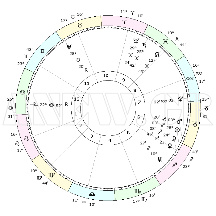 | | ΘΕΣΕΙΣ ΠΛΑΝΗΤΩΝ ΑΣΤΡΟΛΟΓΙΚΟΥ ΧΑΡΤΗ ΤΗΣ ΣΤΙΓΜΗΣ ΑΥΤΗΣ | | | | Πλανήτης | Ζώδιο | Μοίρες | Δεκαήμ. | Σε οίκο | Απόκλιση | | Ακμές των οίκων | | Ηλιος | Τοξότης | 27°59' | Τρίτο | 6 | 23 S 25 | | 1ος | 02°40' | Καρκίνος | | Σελήνη | Τοξότης | 23°15' | Τρίτο | 6 | 28 S 10 | | 2ος | 23°19' | Καρκίνος | | Ερμής | Τοξότης | 10°21' | Δεύτερο | 6 | 21 S 04 | | 3ος | 15°18' | Λέων | | Αφροδίτη | Τοξότης | 23°40' | Τρίτο | 6 | 23 S 18 | | 4ος | 12°03' | Παρθένος | | Αρης | Αιγόκερως | 03°17' | Πρώτο | 7 | 24 S 12 | | 5ος | 16°24' | Ζυγός | | Δίας | Καρκίνος | 22°52'R | Τρίτο | 1 | 21 N 42 | | 6ος | 26°11' | Σκορπιός | | Κρόνος | Ιχθείς | 25°41' | Τρίτο | 10 | 03 S 50 | | 7ος | 02°40' | Αιγόκερως | | Ουρανός | Ταύρος | 28°20'R | Τρίτο | 12 | 19 N 35 | | 8ος | 23°19' | Αιγόκερως | | Ποσειδώνας | Ιχθείς | 29°24' | Τρίτο | 10 | 01 S 28 | | 9ος | 15°18' | Υδροχόος | | Πλούτωνας | Υδροχόος | 02°22' | Πρώτο | 8 | 23 S 18 | | 10ος | 12°03' | Ιχθείς | | Β. Δεσμός | Ιχθείς | 12°49' | Δεύτερο | 10 | 06 S 45 | | 11ος | 16°24' | Κριός | | Ωροσκόπος | Καρκίνος | 02°40' | Πρώτο | | | 12ος | 26°11' | Ταύρος | | Μεσουράνημα | Ιχθείς | 12°03' | Δεύτερο | | | |
