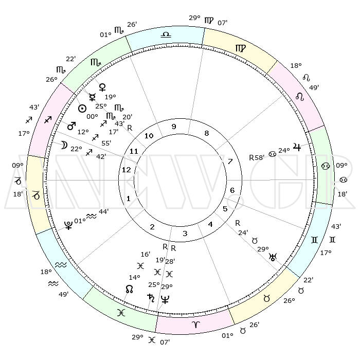 | | ΘΕΣΕΙΣ ΠΛΑΝΗΤΩΝ ΑΣΤΡΟΛΟΓΙΚΟΥ ΧΑΡΤΗ ΤΗΣ ΣΤΙΓΜΗΣ ΑΥΤΗΣ | | | | Πλανήτης | Ζώδιο | Μοίρες | Δεκαήμ. | Σε οίκο | Απόκλιση | | Ακμές των οίκων | | Ηλιος | Τοξότης | 00°14' | Πρώτο | 11 | 20 S 12 | | 1ος | 22°36' | Τοξότης | | Σελήνη | Τοξότης | 22°07' | Τρίτο | 12 | 28 S 09 | | 2ος | 27°57' | Αιγόκερως | | Ερμής | Σκορπιός | 25°47'R | Τρίτο | 11 | 18 S 04 | | 3ος | 07°14' | Ιχθείς | | Αφροδίτη | Σκορπιός | 19°16' | Δεύτερο | 11 | 16 S 35 | | 4ος | 12°13' | Κριός | | Αρης | Τοξότης | 12°53' | Δεύτερο | 12 | 22 S 55 | | 5ος | 09°45' | Ταύρος | | Δίας | Καρκίνος | 24°58'R | Τρίτο | 7 | 21 N 16 | | 6ος | 02°08' | Δίδυμοι | | Κρόνος | Ιχθείς | 25°19'R | Τρίτο | 3 | 04 S 04 | | 7ος | 22°36' | Δίδυμοι | | Ουρανός | Ταύρος | 29°24'R | Τρίτο | 5 | 19 N 49 | | 8ος | 27°57' | Καρκίνος | | Ποσειδώνας | Ιχθείς | 29°28'R | Τρίτο | 3 | 01 S 28 | | 9ος | 07°14' | Παρθένος | | Πλούτωνας | Υδροχόος | 01°44' | Πρώτο | 2 | 23 S 26 | | 10ος | 12°13' | Ζυγός | | Β. Δεσμός | Ιχθείς | 14°16' | Δεύτερο | 3 | 06 S 11 | | 11ος | 09°45' | Σκορπιός | | Ωροσκόπος | Τοξότης | 22°36' | Τρίτο | | | 12ος | 02°08' | Τοξότης | | Μεσουράνημα | Ζυγός | 12°13' | Δεύτερο | | | |