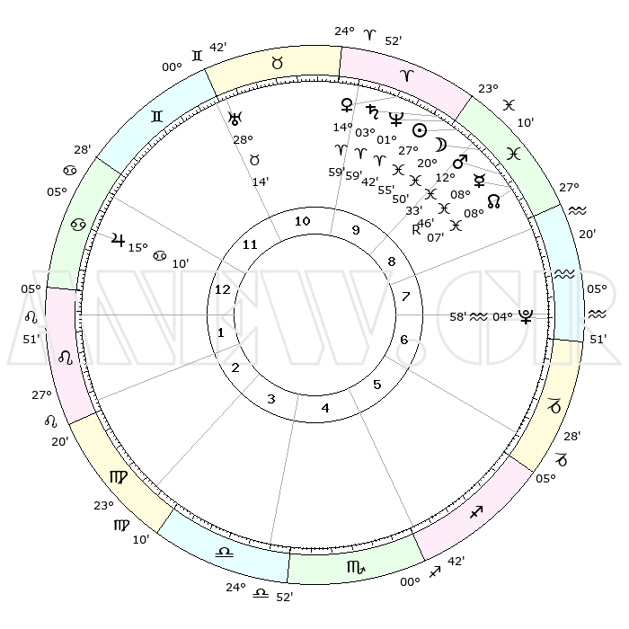 | | ΘΕΣΕΙΣ ΠΛΑΝΗΤΩΝ ΑΣΤΡΟΛΟΓΙΚΟΥ ΧΑΡΤΗ ΤΗΣ ΣΤΙΓΜΗΣ ΑΥΤΗΣ | | | | Πλανήτης | Ζώδιο | Μοίρες | Δεκαήμ. | Σε οίκο | Απόκλιση | | Ακμές των οίκων | | Ηλιος | Ιχθείς | 27°51' | Τρίτο | 9 | 00 S 51 | | 1ος | 19°43' | Καρκίνος | | Σελήνη | Ιχθείς | 20°05' | Τρίτο | 9 | 03 S 00 | | 2ος | 10°15' | Λέων | | Ερμής | Ιχθείς | 08°46'R | Πρώτο | 9 | 06 S 49 | | 3ος | 03°57' | Παρθένος | | Αφροδίτη | Κριός | 14°55' | Δεύτερο | 10 | 05 N 00 | | 4ος | 03°31' | Ζυγός | | Αρης | Ιχθείς | 12°30' | Δεύτερο | 9 | 07 S 52 | | 5ος | 09°30' | Σκορπιός | | Δίας | Καρκίνος | 15°10' | Δεύτερο | 12 | 22 N 56 | | 6ος | 16°56' | Τοξότης | | Κρόνος | Κριός | 03°58' | Πρώτο | 10 | 00 S 22 | | 7ος | 19°43' | Αιγόκερως | | Ουρανός | Ταύρος | 28°14' | Τρίτο | 11 | 19 N 35 | | 8ος | 10°15' | Υδροχόος | | Ποσειδώνας | Κριός | 01°42' | Πρώτο | 9 | 00 S 31 | | 9ος | 03°57' | Ιχθείς | | Πλούτωνας | Υδροχόος | 04°58' | Πρώτο | 7 | 22 S 49 | | 10ος | 03°31' | Κριός | | Β. Δεσμός | Ιχθείς | 08°07' | Πρώτο | 9 | 08 S 31 | | 11ος | 09°30' | Ταύρος | | Ωροσκόπος | Καρκίνος | 19°43' | Δεύτερο | | | 12ος | 16°56' | Δίδυμοι | | Μεσουράνημα | Κριός | 03°31' | Πρώτο | | | |