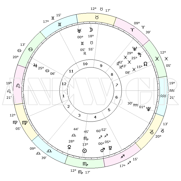 | | ΘΕΣΕΙΣ ΠΛΑΝΗΤΩΝ ΑΣΤΡΟΛΟΓΙΚΟΥ ΧΑΡΤΗ ΤΗΣ ΣΤΙΓΜΗΣ ΑΥΤΗΣ | | | | Πλανήτης | Ζώδιο | Μοίρες | Δεκαήμ. | Σε οίκο | Απόκλιση | | Ακμές των οίκων | | Ηλιος | Σκορπιός | 13°38' | Δεύτερο | 5 | 15 S 56 | | 1ος | 18°41' | Καρκίνος | | Σελήνη | Ταύρος | 17°19' | Δεύτερο | 11 | 21 N 14 | | 2ος | 09°11' | Λέων | | Ερμής | Τοξότης | 05°49' | Πρώτο | 5 | 24 S 00 | | 3ος | 02°46' | Παρθένος | | Αφροδίτη | Ζυγός | 28°36' | Τρίτο | 4 | 09 S 40 | | 4ος | 02°10' | Ζυγός | | Αρης | Τοξότης | 00°55' | Πρώτο | 5 | 20 S 46 | | 5ος | 08°06' | Σκορπιός | | Δίας | Καρκίνος | 25°06' | Τρίτο | 1 | 21 N 12 | | 6ος | 15°43' | Τοξότης | | Κρόνος | Ιχθείς | 25°43'R | Τρίτο | 9 | 03 S 57 | | 7ος | 18°41' | Αιγόκερως | | Ουρανός | Δίδυμοι | 00°05'R | Πρώτο | 11 | 19 N 58 | | 8ος | 09°11' | Υδροχόος | | Ποσειδώνας | Ιχθείς | 29°42'R | Τρίτο | 9 | 01 S 22 | | 9ος | 02°46' | Ιχθείς | | Πλούτωνας | Υδροχόος | 01°29' | Πρώτο | 7 | 23 S 30 | | 10ος | 02°10' | Κριός | | Β. Δεσμός | Ιχθείς | 15°09' | Δεύτερο | 9 | 05 S 51 | | 11ος | 08°06' | Ταύρος | | Ωροσκόπος | Καρκίνος | 18°41' | Δεύτερο | | | 12ος | 15°43' | Δίδυμοι | | Μεσουράνημα | Κριός | 02°10' | Πρώτο | | | |