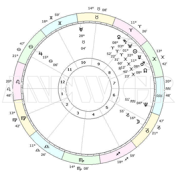| | ΘΕΣΕΙΣ ΠΛΑΝΗΤΩΝ ΑΣΤΡΟΛΟΓΙΚΟΥ ΧΑΡΤΗ ΤΗΣ ΣΤΙΓΜΗΣ ΑΥΤΗΣ | | | | Πλανήτης | Ζώδιο | Μοίρες | Δεκαήμ. | Σε οίκο | Απόκλιση | | Ακμές των οίκων | | Ηλιος | Ιχθείς | 22°57' | Τρίτο | 9 | 02 S 48 | | 1ος | 05°19' | Λέων | | Σελήνη | Αιγόκερως | 16°16' | Δεύτερο | 6 | 26 S 36 | | 2ος | 26°45' | Λέων | | Ερμής | Ιχθείς | 11°14'R | Δεύτερο | 8 | 04 S 48 | | 3ος | 22°31' | Παρθένος | | Αφροδίτη | Κριός | 08°48' | Πρώτο | 9 | 02 N 29 | | 4ος | 24°09' | Ζυγός | | Αρης | Ιχθείς | 08°37' | Πρώτο | 8 | 09 S 21 | | 5ος | 00°01' | Τοξότης | | Δίας | Καρκίνος | 15°06' | Δεύτερο | 12 | 22 N 56 | | 6ος | 04°52' | Αιγόκερως | | Κρόνος | Κριός | 03°22' | Πρώτο | 9 | 00 S 37 | | 7ος | 05°19' | Υδροχόος | | Ουρανός | Ταύρος | 28°04' | Τρίτο | 10 | 19 N 33 | | 8ος | 26°45' | Υδροχόος | | Ποσειδώνας | Κριός | 01°31' | Πρώτο | 9 | 00 S 36 | | 9ος | 22°31' | Ιχθείς | | Πλούτωνας | Υδροχόος | 04°51' | Πρώτο | 6 | 22 S 50 | | 10ος | 24°09' | Κριός | | Β. Δεσμός | Ιχθείς | 08°23' | Πρώτο | 8 | 08 S 26 | | 11ος | 00°01' | Δίδυμοι | | Ωροσκόπος | Λέων | 05°19' | Πρώτο | | | 12ος | 04°52' | Καρκίνος | | Μεσουράνημα | Κριός | 24°09' | Τρίτο | | | |