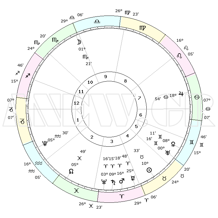 | | ΘΕΣΕΙΣ ΠΛΑΝΗΤΩΝ ΑΣΤΡΟΛΟΓΙΚΟΥ ΧΑΡΤΗ ΤΗΣ ΣΤΙΓΜΗΣ ΑΥΤΗΣ | | | | Πλανήτης | Ζώδιο | Μοίρες | Δεκαήμ. | Σε οίκο | Απόκλιση | | Ακμές των οίκων | | Ηλιος | Ταύρος | 10°31' | Δεύτερο | 5 | 14 N 58 | | 1ος | 21°58' | Τοξότης | | Σελήνη | Σκορπιός | 00°47' | Πρώτο | 10 | 15 S 33 | | 2ος | 27°10' | Αιγόκερως | | Ερμής | Κριός | 25°43' | Τρίτο | 4 | 08 N 08 | | 3ος | 06°22' | Ιχθείς | | Αφροδίτη | Δίδυμοι | 08°07' | Πρώτο | 6 | 22 N 32 | | 4ος | 11°26' | Κριός | | Αρης | Κριός | 16°16' | Δεύτερο | 4 | 05 N 35 | | 5ος | 09°04' | Ταύρος | | Δίας | Καρκίνος | 18°54' | Δεύτερο | 7 | 22 N 29 | | 6ος | 01°30' | Δίδυμοι | | Κρόνος | Κριός | 09°15' | Πρώτο | 3 | 01 N 40 | | 7ος | 21°58' | Δίδυμοι | | Ουρανός | Δίδυμοι | 00°16' | Πρώτο | 5 | 20 N 02 | | 8ος | 27°10' | Καρκίνος | | Ποσειδώνας | Κριός | 03°16' | Πρώτο | 3 | 00 N 05 | | 9ος | 06°22' | Παρθένος | | Πλούτωνας | Υδροχόος | 05°30' | Πρώτο | 2 | 22 S 49 | | 10ος | 11°26' | Ζυγός | | Β. Δεσμός | Ιχθείς | 05°49' | Πρώτο | 2 | 09 S 22 | | 11ος | 09°04' | Σκορπιός | | Ωροσκόπος | Τοξότης | 21°58' | Τρίτο | | | 12ος | 01°30' | Τοξότης | | Μεσουράνημα | Ζυγός | 11°26' | Δεύτερο | | | |
