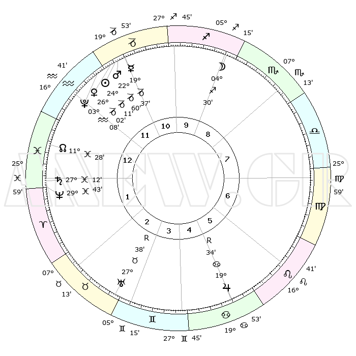 | | ΘΕΣΕΙΣ ΠΛΑΝΗΤΩΝ ΑΣΤΡΟΛΟΓΙΚΟΥ ΧΑΡΤΗ ΤΗΣ ΣΤΙΓΜΗΣ ΑΥΤΗΣ | | | | Πλανήτης | Ζώδιο | Μοίρες | Δεκαήμ. | Σε οίκο | Απόκλιση | | Ακμές των οίκων | | Ηλιος | Αιγόκερως | 24°07' | Τρίτο | 12 | 21 S 17 | | 1ος | 19°04' | Υδροχόος | | Σελήνη | Τοξότης | 03°42' | Πρώτο | 9 | 25 S 53 | | 2ος | 04°52' | Κριός | | Ερμής | Αιγόκερως | 19°30' | Δεύτερο | 11 | 23 S 44 | | 3ος | 09°46' | Ταύρος | | Αφροδίτη | Αιγόκερως | 25°57' | Τρίτο | 12 | 21 S 54 | | 4ος | 05°24' | Δίδυμοι | | Αρης | Αιγόκερως | 22°57' | Τρίτο | 12 | 22 S 26 | | 5ος | 27°14' | Δίδυμοι | | Δίας | Καρκίνος | 19°34'R | Δεύτερο | 5 | 22 N 16 | | 6ος | 19°47' | Καρκίνος | | Κρόνος | Ιχθείς | 27°11' | Τρίτο | 1 | 03 S 09 | | 7ος | 19°04' | Λέων | | Ουρανός | Ταύρος | 27°39'R | Τρίτο | 3 | 19 N 26 | | 8ος | 04°52' | Ζυγός | | Ποσειδώνας | Ιχθείς | 29°43' | Τρίτο | 1 | 01 S 20 | | 9ος | 09°46' | Σκορπιός | | Πλούτωνας | Υδροχόος | 03°08' | Πρώτο | 12 | 23 S 08 | | 10ος | 05°24' | Τοξότης | | Β. Δεσμός | Ιχθείς | 11°28' | Δεύτερο | 1 | 07 S 16 | | 11ος | 27°14' | Τοξότης | | Ωροσκόπος | Υδροχόος | 19°04' | Δεύτερο | | | 12ος | 19°47' | Αιγόκερως | | Μεσουράνημα | Τοξότης | 05°24' | Πρώτο | | | |