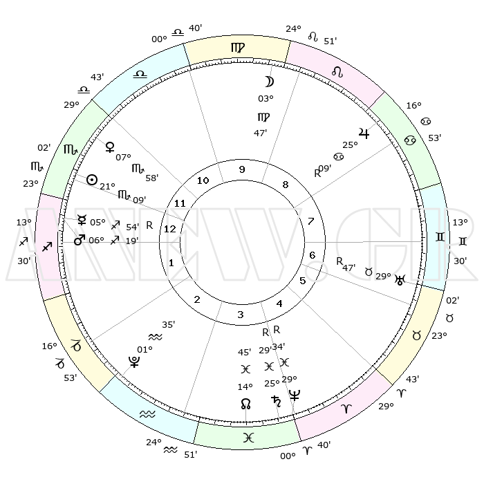 | | ΘΕΣΕΙΣ ΠΛΑΝΗΤΩΝ ΑΣΤΡΟΛΟΓΙΚΟΥ ΧΑΡΤΗ ΤΗΣ ΣΤΙΓΜΗΣ ΑΥΤΗΣ | | | | Πλανήτης | Ζώδιο | Μοίρες | Δεκαήμ. | Σε οίκο | Απόκλιση | | Ακμές των οίκων | | Ηλιος | Σκορπιός | 21°06' | Τρίτο | 12 | 18 S 02 | | 1ος | 26°26' | Σκορπιός | | Σελήνη | Παρθένος | 03°03' | Πρώτο | 9 | 11 N 28 | | 2ος | 27°06' | Τοξότης | | Ερμής | Τοξότης | 05°56'R | Πρώτο | 1 | 22 S 57 | | 3ος | 02°13' | Υδροχόος | | Αφροδίτη | Σκορπιός | 07°54' | Πρώτο | 12 | 12 S 57 | | 4ος | 08°09' | Ιχθείς | | Αρης | Τοξότης | 06°16' | Πρώτο | 1 | 21 S 51 | | 5ος | 09°36' | Κριός | | Δίας | Καρκίνος | 25°09'R | Τρίτο | 8 | 21 N 13 | | 6ος | 05°08' | Ταύρος | | Κρόνος | Ιχθείς | 25°29'R | Τρίτο | 4 | 04 S 02 | | 7ος | 26°26' | Ταύρος | | Ουρανός | Ταύρος | 29°47'R | Τρίτο | 7 | 19 N 54 | | 8ος | 27°06' | Δίδυμοι | | Ποσειδώνας | Ιχθείς | 29°35'R | Τρίτο | 4 | 01 S 25 | | 9ος | 02°13' | Λέων | | Πλούτωνας | Υδροχόος | 01°35' | Πρώτο | 2 | 23 S 29 | | 10ος | 08°09' | Παρθένος | | Β. Δεσμός | Ιχθείς | 14°45' | Δεύτερο | 4 | 06 S 00 | | 11ος | 09°36' | Ζυγός | | Ωροσκόπος | Σκορπιός | 26°26' | Τρίτο | | | 12ος | 05°08' | Σκορπιός | | Μεσουράνημα | Παρθένος | 08°09' | Πρώτο | | | |