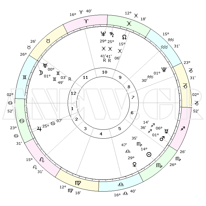 | | ΘΕΣΕΙΣ ΠΛΑΝΗΤΩΝ ΑΣΤΡΟΛΟΓΙΚΟΥ ΧΑΡΤΗ ΤΗΣ ΣΤΙΓΜΗΣ ΑΥΤΗΣ | | | | Πλανήτης | Ζώδιο | Μοίρες | Δεκαήμ. | Σε οίκο | Απόκλιση | | Ακμές των οίκων | | Ηλιος | Σκορπιός | 14°30' | Δεύτερο | 6 | 16 S 11 | | 1ος | 01°05' | Δίδυμοι | | Σελήνη | Δίδυμοι | 00°29' | Πρώτο | 12 | 25 N 00 | | 2ος | 25°40' | Δίδυμοι | | Ερμής | Τοξότης | 06°12' | Πρώτο | 7 | 24 S 00 | | 3ος | 17°03' | Καρκίνος | | Αφροδίτη | Ζυγός | 29°40' | Τρίτο | 6 | 10 S 03 | | 4ος | 09°54' | Λέων | | Αρης | Τοξότης | 01°32' | Πρώτο | 7 | 20 S 54 | | 5ος | 08°33' | Παρθένος | | Δίας | Καρκίνος | 25°07' | Τρίτο | 3 | 21 N 12 | | 6ος | 17°10' | Ζυγός | | Κρόνος | Ιχθείς | 25°41'R | Τρίτο | 11 | 03 S 58 | | 7ος | 01°05' | Τοξότης | | Ουρανός | Δίδυμοι | 00°03'R | Πρώτο | 12 | 19 N 57 | | 8ος | 25°40' | Τοξότης | | Ποσειδώνας | Ιχθείς | 29°41'R | Τρίτο | 11 | 01 S 23 | | 9ος | 17°03' | Αιγόκερως | | Πλούτωνας | Υδροχόος | 01°30' | Πρώτο | 9 | 23 S 30 | | 10ος | 09°54' | Υδροχόος | | Β. Δεσμός | Ιχθείς | 15°06' | Δεύτερο | 11 | 05 S 52 | | 11ος | 08°33' | Ιχθείς | | Ωροσκόπος | Δίδυμοι | 01°05' | Πρώτο | | | 12ος | 17°10' | Κριός | | Μεσουράνημα | Υδροχόος | 09°54' | Πρώτο | | | |