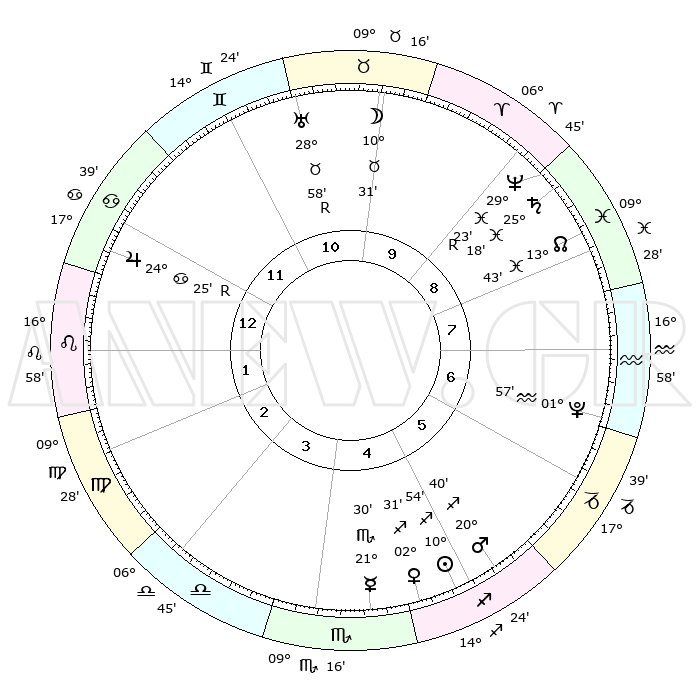 | | ΘΕΣΕΙΣ ΠΛΑΝΗΤΩΝ ΑΣΤΡΟΛΟΓΙΚΟΥ ΧΑΡΤΗ ΤΗΣ ΣΤΙΓΜΗΣ ΑΥΤΗΣ | | | | Πλανήτης | Ζώδιο | Μοίρες | Δεκαήμ. | Σε οίκο | Απόκλιση | | Ακμές των οίκων | | Ηλιος | Τοξότης | 10°52' | Δεύτερο | 5 | 22 S 04 | | 1ος | 07°55' | Λέων | | Σελήνη | Ταύρος | 10°03' | Δεύτερο | 10 | 18 N 46 | | 2ος | 29°34' | Λέων | | Ερμής | Σκορπιός | 21°30' | Τρίτο | 4 | 15 S 36 | | 3ος | 25°41' | Παρθένος | | Αφροδίτη | Τοξότης | 02°29' | Πρώτο | 4 | 20 S 01 | | 4ος | 27°34' | Ζυγός | | Αρης | Τοξότης | 20°39' | Τρίτο | 5 | 23 S 47 | | 5ος | 03°18' | Τοξότης | | Δίας | Καρκίνος | 24°25'R | Τρίτο | 12 | 21 N 24 | | 6ος | 07°45' | Αιγόκερως | | Κρόνος | Ιχθείς | 25°18' | Τρίτο | 8 | 04 S 02 | | 7ος | 07°55' | Υδροχόος | | Ουρανός | Ταύρος | 28°58'R | Τρίτο | 10 | 19 N 43 | | 8ος | 29°34' | Υδροχόος | | Ποσειδώνας | Ιχθείς | 29°23'R | Τρίτο | 9 | 01 S 29 | | 9ος | 25°41' | Ιχθείς | | Πλούτωνας | Υδροχόος | 01°57' | Πρώτο | 6 | 23 S 23 | | 10ος | 27°34' | Κριός | | Β. Δεσμός | Ιχθείς | 13°43' | Δεύτερο | 8 | 06 S 24 | | 11ος | 03°18' | Δίδυμοι | | Ωροσκόπος | Λέων | 07°55' | Πρώτο | | | 12ος | 07°45' | Καρκίνος | | Μεσουράνημα | Κριός | 27°34' | Τρίτο | | | |