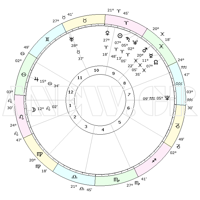 | | ΘΕΣΕΙΣ ΠΛΑΝΗΤΩΝ ΑΣΤΡΟΛΟΓΙΚΟΥ ΧΑΡΤΗ ΤΗΣ ΣΤΙΓΜΗΣ ΑΥΤΗΣ | | | | Πλανήτης | Ζώδιο | Μοίρες | Δεκαήμ. | Σε οίκο | Απόκλιση | | Ακμές των οίκων | | Ηλιος | Κριός | 07°45' | Πρώτο | 10 | 03 N 04 | | 1ος | 17°04' | Καρκίνος | | Σελήνη | Λέων | 11°17' | Δεύτερο | 2 | 19 N 43 | | 2ος | 07°31' | Λέων | | Ερμής | Ιχθείς | 11°03' | Δεύτερο | 9 | 08 S 03 | | 3ος | 00°55' | Παρθένος | | Αφροδίτη | Κριός | 27°14' | Τρίτο | 10 | 09 N 56 | | 4ος | 00°03' | Ζυγός | | Αρης | Ιχθείς | 20°19' | Τρίτο | 9 | 04 S 48 | | 5ος | 05°54' | Σκορπιός | | Δίας | Καρκίνος | 15°34' | Δεύτερο | 12 | 22 N 53 | | 6ος | 13°47' | Τοξότης | | Κρόνος | Κριός | 05°13' | Πρώτο | 10 | 00 N 07 | | 7ος | 17°04' | Αιγόκερως | | Ουρανός | Ταύρος | 28°37' | Τρίτο | 11 | 19 N 41 | | 8ος | 07°31' | Υδροχόος | | Ποσειδώνας | Κριός | 02°05' | Πρώτο | 10 | 00 S 23 | | 9ος | 00°55' | Ιχθείς | | Πλούτωνας | Υδροχόος | 05°09' | Πρώτο | 7 | 22 S 48 | | 10ος | 00°03' | Κριός | | Β. Δεσμός | Ιχθείς | 07°36' | Πρώτο | 9 | 08 S 43 | | 11ος | 05°54' | Ταύρος | | Ωροσκόπος | Καρκίνος | 17°04' | Δεύτερο | | | 12ος | 13°47' | Δίδυμοι | | Μεσουράνημα | Κριός | 00°03' | Πρώτο | | | |