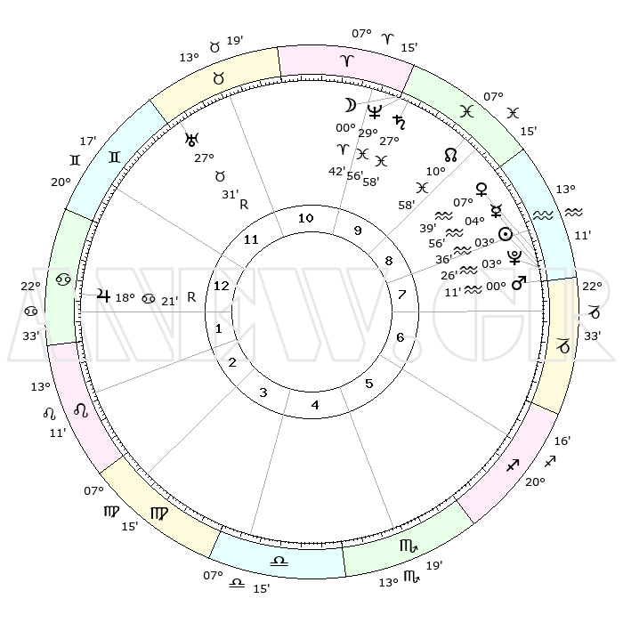 | | ΘΕΣΕΙΣ ΠΛΑΝΗΤΩΝ ΑΣΤΡΟΛΟΓΙΚΟΥ ΧΑΡΤΗ ΤΗΣ ΣΤΙΓΜΗΣ ΑΥΤΗΣ | | | | Πλανήτης | Ζώδιο | Μοίρες | Δεκαήμ. | Σε οίκο | Απόκλιση | | Ακμές των οίκων | | Ηλιος | Υδροχόος | 03°32' | Πρώτο | 8 | 19 S 22 | | 1ος | 29°09' | Δίδυμοι | | Σελήνη | Ιχθείς | 29°41' | Τρίτο | 10 | 01 N 32 | | 2ος | 19°59' | Καρκίνος | | Ερμής | Υδροχόος | 04°48' | Πρώτο | 8 | 21 S 05 | | 3ος | 11°44' | Λέων | | Αφροδίτη | Υδροχόος | 07°34' | Πρώτο | 8 | 19 S 32 | | 4ος | 07°55' | Παρθένος | | Αρης | Υδροχόος | 00°08' | Πρώτο | 8 | 21 S 06 | | 5ος | 11°43' | Ζυγός | | Δίας | Καρκίνος | 18°22'R | Δεύτερο | 1 | 22 N 28 | | 6ος | 21°47' | Σκορπιός | | Κρόνος | Ιχθείς | 27°58' | Τρίτο | 10 | 02 S 49 | | 7ος | 29°09' | Τοξότης | | Ουρανός | Ταύρος | 27°31'R | Τρίτο | 12 | 19 N 25 | | 8ος | 19°59' | Αιγόκερως | | Ποσειδώνας | Ιχθείς | 29°55' | Τρίτο | 10 | 01 S 14 | | 9ος | 11°44' | Υδροχόος | | Πλούτωνας | Υδροχόος | 03°26' | Πρώτο | 8 | 23 S 04 | | 10ος | 07°55' | Ιχθείς | | Β. Δεσμός | Ιχθείς | 10°59' | Δεύτερο | 10 | 07 S 27 | | 11ος | 11°43' | Κριός | | Ωροσκόπος | Δίδυμοι | 29°09' | Τρίτο | | | 12ος | 21°47' | Ταύρος | | Μεσουράνημα | Ιχθείς | 07°55' | Πρώτο | | | |