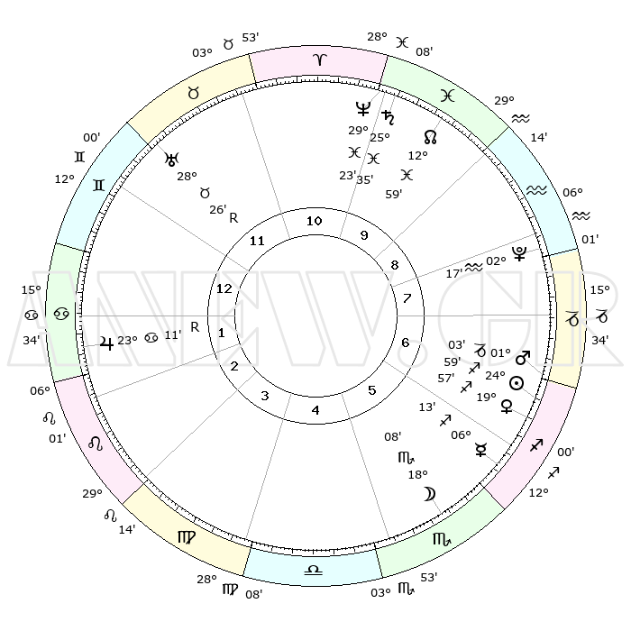 | | ΘΕΣΕΙΣ ΠΛΑΝΗΤΩΝ ΑΣΤΡΟΛΟΓΙΚΟΥ ΧΑΡΤΗ ΤΗΣ ΣΤΙΓΜΗΣ ΑΥΤΗΣ | | | | Πλανήτης | Ζώδιο | Μοίρες | Δεκαήμ. | Σε οίκο | Απόκλιση | | Ακμές των οίκων | | Ηλιος | Τοξότης | 24°39' | Τρίτο | 10 | 23 S 19 | | 1ος | 17°40' | Υδροχόος | | Σελήνη | Σκορπιός | 14°20' | Δεύτερο | 9 | 20 S 20 | | 2ος | 03°27' | Κριός | | Ερμής | Τοξότης | 05°47' | Πρώτο | 10 | 19 S 55 | | 3ος | 08°38' | Ταύρος | | Αφροδίτη | Τοξότης | 19°33' | Δεύτερο | 10 | 22 S 55 | | 4ος | 04°26' | Δίδυμοι | | Αρης | Αιγόκερως | 00°48' | Πρώτο | 11 | 24 S 13 | | 5ος | 26°19' | Δίδυμοι | | Δίας | Καρκίνος | 23°13'R | Τρίτο | 6 | 21 N 38 | | 6ος | 18°46' | Καρκίνος | | Κρόνος | Ιχθείς | 25°34' | Τρίτο | 1 | 03 S 53 | | 7ος | 17°40' | Λέων | | Ουρανός | Ταύρος | 28°27'R | Τρίτο | 3 | 19 N 37 | | 8ος | 03°27' | Ζυγός | | Ποσειδώνας | Ιχθείς | 29°23' | Τρίτο | 1 | 01 S 29 | | 9ος | 08°38' | Σκορπιός | | Πλούτωνας | Υδροχόος | 02°17' | Πρώτο | 12 | 23 S 19 | | 10ος | 04°26' | Τοξότης | | Β. Δεσμός | Ιχθείς | 12°60' | Δεύτερο | 1 | 06 S 41 | | 11ος | 26°19' | Τοξότης | | Ωροσκόπος | Υδροχόος | 17°40' | Δεύτερο | | | 12ος | 18°46' | Αιγόκερως | | Μεσουράνημα | Τοξότης | 04°26' | Πρώτο | | | |