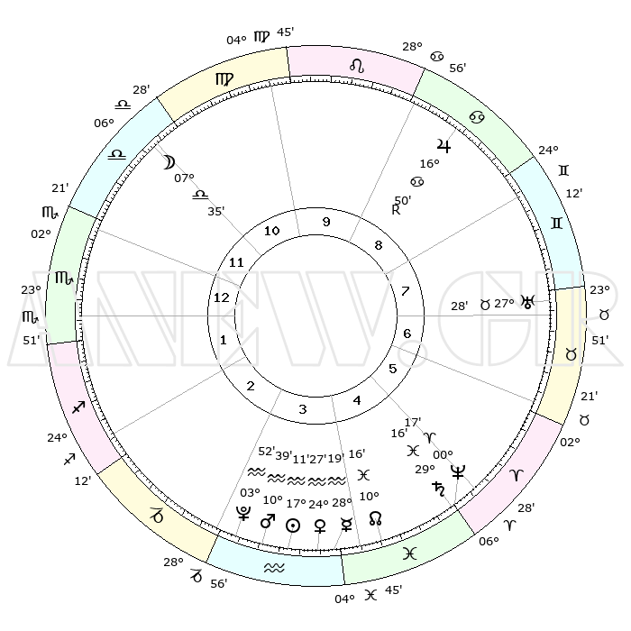 | | ΘΕΣΕΙΣ ΠΛΑΝΗΤΩΝ ΑΣΤΡΟΛΟΓΙΚΟΥ ΧΑΡΤΗ ΤΗΣ ΣΤΙΓΜΗΣ ΑΥΤΗΣ | | | | Πλανήτης | Ζώδιο | Μοίρες | Δεκαήμ. | Σε οίκο | Απόκλιση | | Ακμές των οίκων | | Ηλιος | Υδροχόος | 17°07' | Δεύτερο | 4 | 15 S 42 | | 1ος | 04°20' | Σκορπιός | | Σελήνη | Ζυγός | 06°44' | Πρώτο | 11 | 04 S 55 | | 2ος | 03°01' | Τοξότης | | Ερμής | Υδροχόος | 28°12' | Τρίτο | 4 | 13 S 28 | | 3ος | 05°21' | Αιγόκερως | | Αφροδίτη | Υδροχόος | 24°22' | Τρίτο | 4 | 14 S 44 | | 4ος | 09°50' | Υδροχόος | | Αρης | Υδροχόος | 10°36' | Δεύτερο | 4 | 18 S 36 | | 5ος | 12°41' | Ιχθείς | | Δίας | Καρκίνος | 16°50'R | Δεύτερο | 9 | 22 N 41 | | 6ος | 10°56' | Κριός | | Κρόνος | Ιχθείς | 29°15' | Τρίτο | 5 | 02 S 17 | | 7ος | 04°20' | Ταύρος | | Ουρανός | Ταύρος | 27°28' | Τρίτο | 7 | 19 N 24 | | 8ος | 03°01' | Δίδυμοι | | Ποσειδώνας | Κριός | 00°17' | Πρώτο | 5 | 01 S 06 | | 9ος | 05°21' | Καρκίνος | | Πλούτωνας | Υδροχόος | 03°51' | Πρώτο | 3 | 23 S 00 | | 10ος | 09°50' | Λέων | | Β. Δεσμός | Ιχθείς | 10°16' | Δεύτερο | 4 | 07 S 43 | | 11ος | 12°41' | Παρθένος | | Ωροσκόπος | Σκορπιός | 04°20' | Πρώτο | | | 12ος | 10°56' | Ζυγός | | Μεσουράνημα | Λέων | 09°50' | Πρώτο | | | |