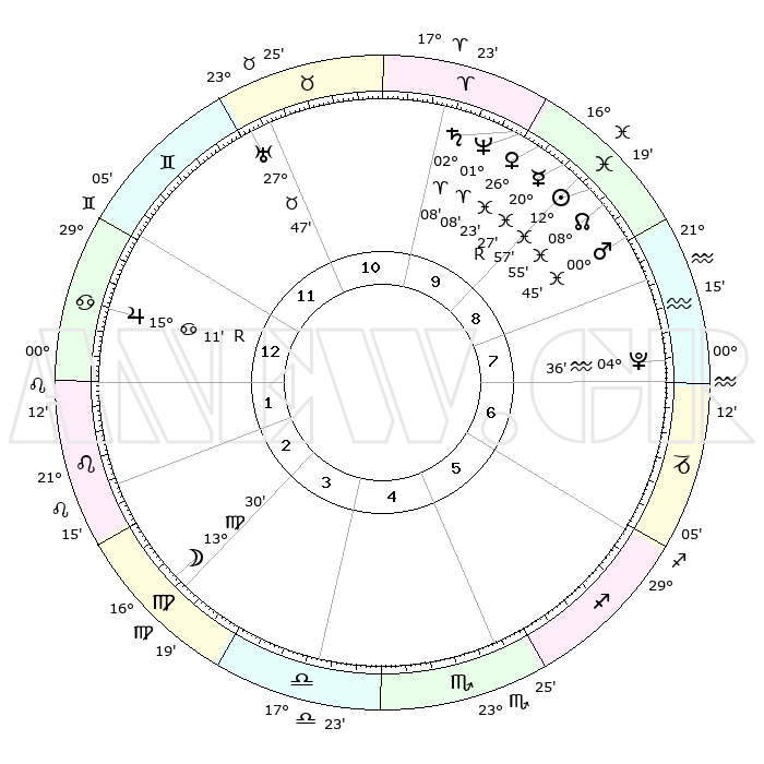 | | ΘΕΣΕΙΣ ΠΛΑΝΗΤΩΝ ΑΣΤΡΟΛΟΓΙΚΟΥ ΧΑΡΤΗ ΤΗΣ ΣΤΙΓΜΗΣ ΑΥΤΗΣ | | | | Πλανήτης | Ζώδιο | Μοίρες | Δεκαήμ. | Σε οίκο | Απόκλιση | | Ακμές των οίκων | | Ηλιος | Ιχθείς | 12°53' | Δεύτερο | 9 | 06 S 43 | | 1ος | 11°02' | Καρκίνος | | Σελήνη | Παρθένος | 12°40' | Δεύτερο | 3 | 06 N 30 | | 2ος | 01°28' | Λέων | | Ερμής | Ιχθείς | 20°30'R | Τρίτο | 9 | 00 S 27 | | 3ος | 24°11' | Λέων | | Αφροδίτη | Ιχθείς | 26°18' | Τρίτο | 10 | 02 S 41 | | 4ος | 22°20' | Παρθένος | | Αρης | Ιχθείς | 00°42' | Πρώτο | 9 | 12 S 15 | | 5ος | 27°43' | Ζυγός | | Δίας | Καρκίνος | 15°11'R | Δεύτερο | 1 | 22 N 55 | | 6ος | 06°31' | Τοξότης | | Κρόνος | Κριός | 02°08' | Πρώτο | 10 | 01 S 06 | | 7ος | 11°02' | Αιγόκερως | | Ουρανός | Ταύρος | 27°47' | Τρίτο | 11 | 19 N 29 | | 8ος | 01°28' | Υδροχόος | | Ποσειδώνας | Κριός | 01°08' | Πρώτο | 10 | 00 S 45 | | 9ος | 24°11' | Υδροχόος | | Πλούτωνας | Υδροχόος | 04°36' | Πρώτο | 8 | 22 S 52 | | 10ος | 22°20' | Ιχθείς | | Β. Δεσμός | Ιχθείς | 08°55' | Πρώτο | 9 | 08 S 14 | | 11ος | 27°43' | Κριός | | Ωροσκόπος | Καρκίνος | 11°02' | Δεύτερο | | | 12ος | 06°31' | Δίδυμοι | | Μεσουράνημα | Ιχθείς | 22°20' | Τρίτο | | | |
