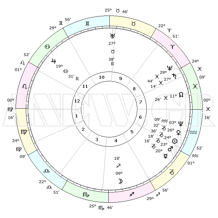 | | ΘΕΣΕΙΣ ΠΛΑΝΗΤΩΝ ΑΣΤΡΟΛΟΓΙΚΟΥ ΧΑΡΤΗ ΤΗΣ ΣΤΙΓΜΗΣ ΑΥΤΗΣ | | | | Πλανήτης | Ζώδιο | Μοίρες | Δεκαήμ. | Σε οίκο | Απόκλιση | | Ακμές των οίκων | | Ηλιος | Αιγόκερως | 24°31' | Τρίτο | 6 | 21 S 13 | | 1ος | 09°08' | Λέων | | Σελήνη | Τοξότης | 08°26' | Πρώτο | 5 | 26 S 46 | | 2ος | 00°53' | Παρθένος | | Ερμής | Αιγόκερως | 20°09' | Τρίτο | 6 | 23 S 40 | | 3ος | 27°10' | Παρθένος | | Αφροδίτη | Αιγόκερως | 26°27' | Τρίτο | 6 | 21 S 49 | | 4ος | 29°10' | Ζυγός | | Αρης | Αιγόκερως | 23°15' | Τρίτο | 6 | 22 S 23 | | 5ος | 04°49' | Τοξότης | | Δίας | Καρκίνος | 19°31'R | Δεύτερο | 12 | 22 N 17 | | 6ος | 09°06' | Αιγόκερως | | Κρόνος | Ιχθείς | 27°13' | Τρίτο | 9 | 03 S 08 | | 7ος | 09°08' | Υδροχόος | | Ουρανός | Ταύρος | 27°38'R | Τρίτο | 10 | 19 N 26 | | 8ος | 00°53' | Ιχθείς | | Ποσειδώνας | Ιχθείς | 29°44' | Τρίτο | 9 | 01 S 19 | | 9ος | 27°10' | Ιχθείς | | Πλούτωνας | Υδροχόος | 03°09' | Πρώτο | 6 | 23 S 08 | | 10ος | 29°10' | Κριός | | Β. Δεσμός | Ιχθείς | 11°27' | Δεύτερο | 8 | 07 S 16 | | 11ος | 04°50' | Δίδυμοι | | Ωροσκόπος | Λέων | 09°08' | Πρώτο | | | 12ος | 09°06' | Καρκίνος | | Μεσουράνημα | Κριός | 29°10' | Τρίτο | | | |