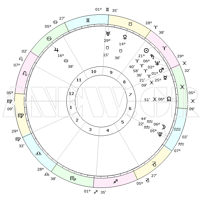 | | ΘΕΣΕΙΣ ΠΛΑΝΗΤΩΝ ΑΣΤΡΟΛΟΓΙΚΟΥ ΧΑΡΤΗ ΤΗΣ ΣΤΙΓΜΗΣ ΑΥΤΗΣ | | | | Πλανήτης | Ζώδιο | Μοίρες | Δεκαήμ. | Σε οίκο | Απόκλιση | | Ακμές των οίκων | | Ηλιος | Κριός | 21°36' | Τρίτο | 9 | 08 N 25 | | 1ος | 18°12' | Λέων | | Σελήνη | Υδροχόος | 06°01' | Πρώτο | 6 | 21 S 26 | | 2ος | 10°49' | Παρθένος | | Ερμής | Ιχθείς | 25°05' | Τρίτο | 8 | 04 S 11 | | 3ος | 08°15' | Ζυγός | | Αφροδίτη | Ταύρος | 14°32' | Δεύτερο | 10 | 16 N 12 | | 4ος | 10°50' | Σκορπιός | | Αρης | Κριός | 01°18' | Πρώτο | 8 | 00 S 24 | | 5ος | 15°53' | Τοξότης | | Δίας | Καρκίνος | 16°37' | Δεύτερο | 11 | 22 N 46 | | 6ος | 18°59' | Αιγόκερως | | Κρόνος | Κριός | 06°57' | Πρώτο | 8 | 00 N 48 | | 7ος | 18°12' | Υδροχόος | | Ουρανός | Ταύρος | 29°15' | Τρίτο | 10 | 19 N 49 | | 8ος | 10°49' | Ιχθείς | | Ποσειδώνας | Κριός | 02°36' | Πρώτο | 8 | 00 S 10 | | 9ος | 08°15' | Κριός | | Πλούτωνας | Υδροχόος | 05°22' | Πρώτο | 6 | 22 S 47 | | 10ος | 10°50' | Ταύρος | | Β. Δεσμός | Ιχθείς | 06°51' | Πρώτο | 7 | 09 S 00 | | 11ος | 15°53' | Δίδυμοι | | Ωροσκόπος | Λέων | 18°12' | Δεύτερο | | | 12ος | 18°59' | Καρκίνος | | Μεσουράνημα | Ταύρος | 10°50' | Δεύτερο | | | |