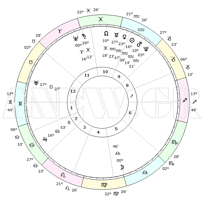 | | ΘΕΣΕΙΣ ΠΛΑΝΗΤΩΝ ΑΣΤΡΟΛΟΓΙΚΟΥ ΧΑΡΤΗ ΤΗΣ ΣΤΙΓΜΗΣ ΑΥΤΗΣ | | | | Πλανήτης | Ζώδιο | Μοίρες | Δεκαήμ. | Σε οίκο | Απόκλιση | | Ακμές των οίκων | | Ηλιος | Υδροχόος | 16°35' | Δεύτερο | 10 | 15 S 52 | | 1ος | 17°40' | Ταύρος | | Σελήνη | Παρθένος | 29°59' | Τρίτο | 5 | 01 S 43 | | 2ος | 15°14' | Δίδυμοι | | Ερμής | Υδροχόος | 27°16' | Τρίτο | 11 | 13 S 51 | | 3ος | 07°18' | Καρκίνος | | Αφροδίτη | Υδροχόος | 23°42' | Τρίτο | 10 | 14 S 57 | | 4ος | 29°21' | Καρκίνος | | Αρης | Υδροχόος | 10°11' | Δεύτερο | 10 | 18 S 42 | | 5ος | 25°53' | Λέων | | Δίας | Καρκίνος | 16°53'R | Δεύτερο | 3 | 22 N 41 | | 6ος | 02°07' | Ζυγός | | Κρόνος | Ιχθείς | 29°12' | Τρίτο | 11 | 02 S 18 | | 7ος | 17°40' | Σκορπιός | | Ουρανός | Ταύρος | 27°27' | Τρίτο | 1 | 19 N 24 | | 8ος | 15°14' | Τοξότης | | Ποσειδώνας | Κριός | 00°16' | Πρώτο | 11 | 01 S 06 | | 9ος | 07°18' | Αιγόκερως | | Πλούτωνας | Υδροχόος | 03°50' | Πρώτο | 10 | 23 S 00 | | 10ος | 29°21' | Αιγόκερως | | Β. Δεσμός | Ιχθείς | 10°18' | Δεύτερο | 11 | 07 S 42 | | 11ος | 25°53' | Υδροχόος | | Ωροσκόπος | Ταύρος | 17°40' | Δεύτερο | | | 12ος | 02°07' | Κριός | | Μεσουράνημα | Αιγόκερως | 29°21' | Τρίτο | | | |