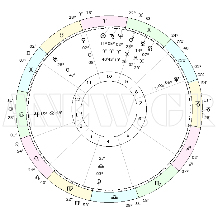 | | ΘΕΣΕΙΣ ΠΛΑΝΗΤΩΝ ΑΣΤΡΟΛΟΓΙΚΟΥ ΧΑΡΤΗ ΤΗΣ ΣΤΙΓΜΗΣ ΑΥΤΗΣ | | | | Πλανήτης | Ζώδιο | Μοίρες | Δεκαήμ. | Σε οίκο | Απόκλιση | | Ακμές των οίκων | | Ηλιος | Κριός | 11°36' | Δεύτερο | 11 | 04 N 35 | | 1ος | 20°24' | Δίδυμοι | | Σελήνη | Ζυγός | 02°38' | Πρώτο | 5 | 02 S 59 | | 2ος | 12°00' | Καρκίνος | | Ερμής | Ιχθείς | 13°59' | Δεύτερο | 10 | 07 S 33 | | 3ος | 03°21' | Λέων | | Αφροδίτη | Ταύρος | 02°03' | Πρώτο | 11 | 11 N 47 | | 4ος | 28°14' | Λέων | | Αρης | Ιχθείς | 23°23' | Τρίτο | 10 | 03 S 35 | | 5ος | 00°29' | Ζυγός | | Δίας | Καρκίνος | 15°48' | Δεύτερο | 2 | 22 N 52 | | 6ος | 10°47' | Σκορπιός | | Κρόνος | Κριός | 05°42' | Πρώτο | 11 | 00 N 19 | | 7ος | 20°24' | Τοξότης | | Ουρανός | Ταύρος | 28°47' | Τρίτο | 12 | 19 N 43 | | 8ος | 12°00' | Αιγόκερως | | Ποσειδώνας | Κριός | 02°13' | Πρώτο | 11 | 00 S 19 | | 9ος | 03°21' | Υδροχόος | | Πλούτωνας | Υδροχόος | 05°13' | Πρώτο | 9 | 22 S 47 | | 10ος | 28°14' | Υδροχόος | | Β. Δεσμός | Ιχθείς | 07°23' | Πρώτο | 10 | 08 S 48 | | 11ος | 00°29' | Κριός | | Ωροσκόπος | Δίδυμοι | 20°24' | Τρίτο | | | 12ος | 10°47' | Ταύρος | | Μεσουράνημα | Υδροχόος | 28°14' | Τρίτο | | | |