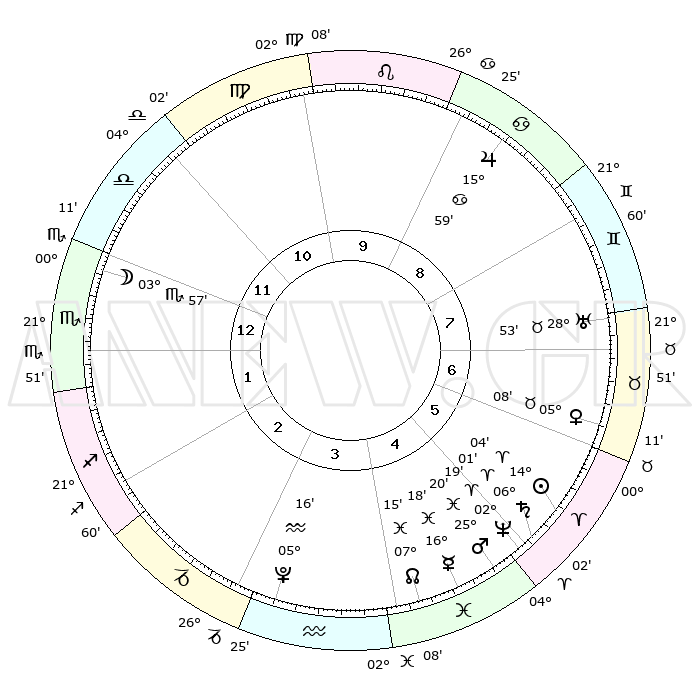 | | ΘΕΣΕΙΣ ΠΛΑΝΗΤΩΝ ΑΣΤΡΟΛΟΓΙΚΟΥ ΧΑΡΤΗ ΤΗΣ ΣΤΙΓΜΗΣ ΑΥΤΗΣ | | | | Πλανήτης | Ζώδιο | Μοίρες | Δεκαήμ. | Σε οίκο | Απόκλιση | | Ακμές των οίκων | | Ηλιος | Κριός | 14°01' | Δεύτερο | 6 | 05 N 31 | | 1ος | 02°57' | Σκορπιός | | Σελήνη | Σκορπιός | 03°09' | Πρώτο | 1 | 16 S 31 | | 2ος | 01°32' | Τοξότης | | Ερμής | Ιχθείς | 16°14' | Δεύτερο | 5 | 07 S 00 | | 3ος | 03°44' | Αιγόκερως | | Αφροδίτη | Ταύρος | 05°03' | Πρώτο | 7 | 12 N 54 | | 4ος | 08°08' | Υδροχόος | | Αρης | Ιχθείς | 25°17' | Τρίτο | 5 | 02 S 49 | | 5ος | 11°00' | Ιχθείς | | Δίας | Καρκίνος | 15°58' | Δεύτερο | 9 | 22 N 51 | | 6ος | 09°24' | Κριός | | Κρόνος | Κριός | 06°00' | Πρώτο | 5 | 00 N 26 | | 7ος | 02°57' | Ταύρος | | Ουρανός | Ταύρος | 28°53' | Τρίτο | 7 | 19 N 44 | | 8ος | 01°32' | Δίδυμοι | | Ποσειδώνας | Κριός | 02°19' | Πρώτο | 5 | 00 S 17 | | 9ος | 03°44' | Καρκίνος | | Πλούτωνας | Υδροχόος | 05°16' | Πρώτο | 3 | 22 S 47 | | 10ος | 08°08' | Λέων | | Β. Δεσμός | Ιχθείς | 07°15' | Πρώτο | 4 | 08 S 51 | | 11ος | 11°00' | Παρθένος | | Ωροσκόπος | Σκορπιός | 02°57' | Πρώτο | | | 12ος | 09°24' | Ζυγός | | Μεσουράνημα | Λέων | 08°08' | Πρώτο | | | |