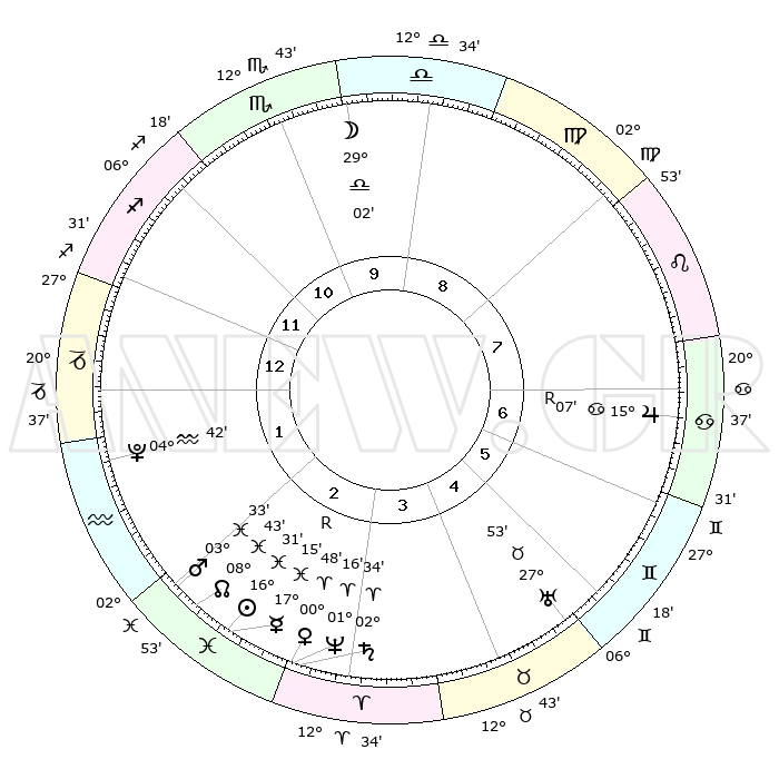| | ΘΕΣΕΙΣ ΠΛΑΝΗΤΩΝ ΑΣΤΡΟΛΟΓΙΚΟΥ ΧΑΡΤΗ ΤΗΣ ΣΤΙΓΜΗΣ ΑΥΤΗΣ | | | | Πλανήτης | Ζώδιο | Μοίρες | Δεκαήμ. | Σε οίκο | Απόκλιση | | Ακμές των οίκων | | Ηλιος | Ιχθείς | 16°24' | Δεύτερο | 3 | 05 S 22 | | 1ος | 10°49' | Τοξότης | | Σελήνη | Ζυγός | 27°34' | Τρίτο | 11 | 14 S 18 | | 2ος | 13°41' | Αιγόκερως | | Ερμής | Ιχθείς | 17°22'R | Δεύτερο | 3 | 01 S 37 | | 3ος | 21°13' | Υδροχόος | | Αφροδίτη | Κριός | 00°40' | Πρώτο | 4 | 00 S 53 | | 4ος | 27°11' | Ιχθείς | | Αρης | Ιχθείς | 03°27' | Πρώτο | 3 | 11 S 15 | | 5ος | 26°40' | Κριός | | Δίας | Καρκίνος | 15°07'R | Δεύτερο | 8 | 22 N 56 | | 6ος | 20°18' | Ταύρος | | Κρόνος | Κριός | 02°33' | Πρώτο | 4 | 00 S 56 | | 7ος | 10°49' | Δίδυμοι | | Ουρανός | Ταύρος | 27°53' | Τρίτο | 6 | 19 N 30 | | 8ος | 13°41' | Καρκίνος | | Ποσειδώνας | Κριός | 01°16' | Πρώτο | 4 | 00 S 42 | | 9ος | 21°13' | Λέων | | Πλούτωνας | Υδροχόος | 04°42' | Πρώτο | 2 | 22 S 51 | | 10ος | 27°11' | Παρθένος | | Β. Δεσμός | Ιχθείς | 08°44' | Πρώτο | 3 | 08 S 18 | | 11ος | 26°40' | Ζυγός | | Ωροσκόπος | Τοξότης | 10°49' | Δεύτερο | | | 12ος | 20°18' | Σκορπιός | | Μεσουράνημα | Παρθένος | 27°11' | Τρίτο | | | |