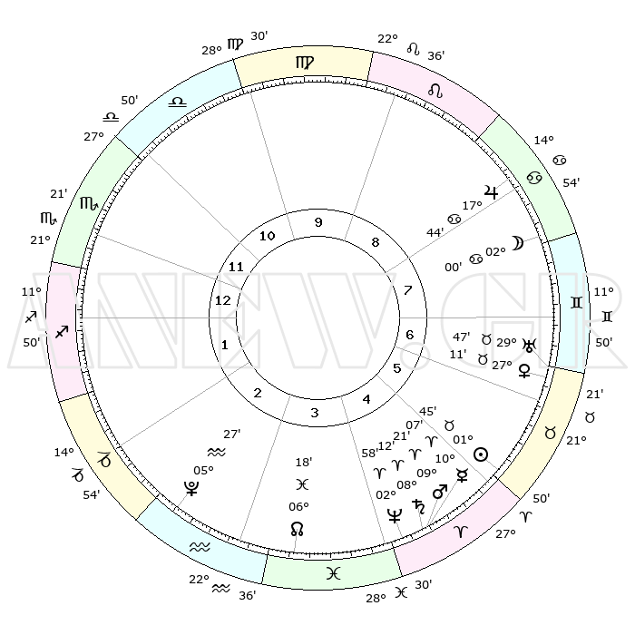 | | ΘΕΣΕΙΣ ΠΛΑΝΗΤΩΝ ΑΣΤΡΟΛΟΓΙΚΟΥ ΧΑΡΤΗ ΤΗΣ ΣΤΙΓΜΗΣ ΑΥΤΗΣ | | | | Πλανήτης | Ζώδιο | Μοίρες | Δεκαήμ. | Σε οίκο | Απόκλιση | | Ακμές των οίκων | | Ηλιος | Ταύρος | 01°41' | Πρώτο | 6 | 12 N 03 | | 1ος | 22°13' | Σκορπιός | | Σελήνη | Καρκίνος | 01°02' | Πρώτο | 8 | 28 N 06 | | 2ος | 22°23' | Τοξότης | | Ερμής | Κριός | 10°00' | Δεύτερο | 5 | 01 N 35 | | 3ος | 26°52' | Αιγόκερως | | Αφροδίτη | Ταύρος | 27°06' | Τρίτο | 7 | 19 N 59 | | 4ος | 02°36' | Ιχθείς | | Αρης | Κριός | 09°17' | Πρώτο | 5 | 02 N 49 | | 5ος | 04°28' | Κριός | | Δίας | Καρκίνος | 17°43' | Δεύτερο | 8 | 22 N 38 | | 6ος | 00°35' | Ταύρος | | Κρόνος | Κριός | 08°12' | Πρώτο | 5 | 01 N 16 | | 7ος | 22°13' | Ταύρος | | Ουρανός | Ταύρος | 29°46' | Τρίτο | 7 | 19 N 56 | | 8ος | 22°23' | Δίδυμοι | | Ποσειδώνας | Κριός | 02°58' | Πρώτο | 4 | 00 S 02 | | 9ος | 26°52' | Καρκίνος | | Πλούτωνας | Υδροχόος | 05°27' | Πρώτο | 3 | 22 S 48 | | 10ος | 02°36' | Παρθένος | | Β. Δεσμός | Ιχθείς | 06°18' | Πρώτο | 4 | 09 S 12 | | 11ος | 04°28' | Ζυγός | | Ωροσκόπος | Σκορπιός | 22°13' | Τρίτο | | | 12ος | 00°35' | Σκορπιός | | Μεσουράνημα | Παρθένος | 02°36' | Πρώτο | | | |