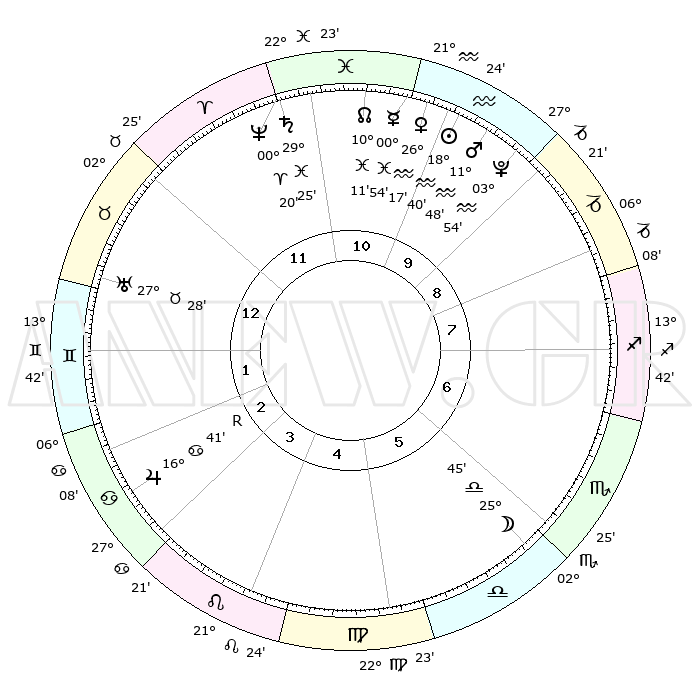 | | ΘΕΣΕΙΣ ΠΛΑΝΗΤΩΝ ΑΣΤΡΟΛΟΓΙΚΟΥ ΧΑΡΤΗ ΤΗΣ ΣΤΙΓΜΗΣ ΑΥΤΗΣ | | | | Πλανήτης | Ζώδιο | Μοίρες | Δεκαήμ. | Σε οίκο | Απόκλιση | | Ακμές των οίκων | | Ηλιος | Υδροχόος | 18°36' | Δεύτερο | 10 | 15 S 15 | | 1ος | 15°17' | Ταύρος | | Σελήνη | Ζυγός | 24°56' | Τρίτο | 6 | 13 S 09 | | 2ος | 13°27' | Δίδυμοι | | Ερμής | Ιχθείς | 00°47' | Πρώτο | 11 | 12 S 24 | | 3ος | 05°40' | Καρκίνος | | Αφροδίτη | Υδροχόος | 26°12' | Τρίτο | 11 | 14 S 08 | | 4ος | 27°39' | Καρκίνος | | Αρης | Υδροχόος | 11°45' | Δεύτερο | 10 | 18 S 17 | | 5ος | 23°50' | Λέων | | Δίας | Καρκίνος | 16°41'R | Δεύτερο | 3 | 22 N 42 | | 6ος | 29°36' | Παρθένος | | Κρόνος | Ιχθείς | 29°24' | Τρίτο | 11 | 02 S 13 | | 7ος | 15°17' | Σκορπιός | | Ουρανός | Ταύρος | 27°28' | Τρίτο | 1 | 19 N 24 | | 8ος | 13°27' | Τοξότης | | Ποσειδώνας | Κριός | 00°20' | Πρώτο | 12 | 01 S 04 | | 9ος | 05°40' | Αιγόκερως | | Πλούτωνας | Υδροχόος | 03°54' | Πρώτο | 10 | 22 S 59 | | 10ος | 27°39' | Αιγόκερως | | Β. Δεσμός | Ιχθείς | 10°11' | Δεύτερο | 11 | 07 S 45 | | 11ος | 23°50' | Υδροχόος | | Ωροσκόπος | Ταύρος | 15°17' | Δεύτερο | | | 12ος | 29°36' | Ιχθείς | | Μεσουράνημα | Αιγόκερως | 27°39' | Τρίτο | | | |