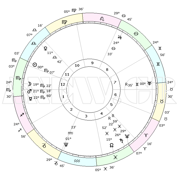 | ΘΕΣΕΙΣ ΠΛΑΝΗΤΩΝ ΑΣΤΡΟΛΟΓΙΚΟΥ ΧΑΡΤΗ ΤΗΣ ΣΤΙΓΜΗΣ ΑΥΤΗΣ | | Πλανήτης | Ζώδιο | Μοίρες | Δεκαήμ. | Σε οίκο | Απόκλιση | | Ακμές των οίκων | Ηλιος | Ζυγός | 29°59' | Τρίτο | 1 | 11 S 28 | | 1ος | 16°45' | Ζυγός | Σελήνη | Σκορπιός | 17°49' | Δεύτερο | 2 | 21 S 25 | | 2ος | 14°24' | Σκορπιός | Ερμής | Σκορπιός | 22°50' | Τρίτο | 2 | 20 S 53 | | 3ος | 15°31' | Τοξότης | Αφροδίτη | Ζυγός | 11°32' | Δεύτερο | 12 | 03 S 09 | | 4ος | 18°58' | Αιγόκερως | Αρης | Σκορπιός | 21°13' | Τρίτο | 2 | 18 S 21 | | 5ος | 21°54' | Υδροχόος | Δίας | Καρκίνος | 24°32' | Τρίτο | 10 | 21 N 16 | | 6ος | 21°34' | Ιχθείς | Κρόνος | Ιχθείς | 26°23'R | Τρίτο | 6 | 03 S 43 | | 7ος | 16°45' | Κριός | Ουρανός | Δίδυμοι | 00°36'R | Πρώτο | 8 | 20 N 04 | | 8ος | 14°24' | Ταύρος | Ποσειδώνας | Ιχθείς | 29°59'R | Τρίτο | 6 | 01 S 16 | | 9ος | 15°31' | Δίδυμοι | Πλούτωνας | Υδροχόος | 01°23' | Πρώτο | 4 | 23 S 32 | | 10ος | 18°58' | Καρκίνος | Β. Δεσμός | Ιχθείς | 15°52' | Δεύτερο | 5 | 05 S 34 | | 11ος | 21°54' | Λέων | Ωροσκόπος | Ζυγός | 16°45' | Δεύτερο | | | 12ος | 21°34' | Παρθένος | Μεσουράνημα | Καρκίνος | 18°58' | Δεύτερο | | | |