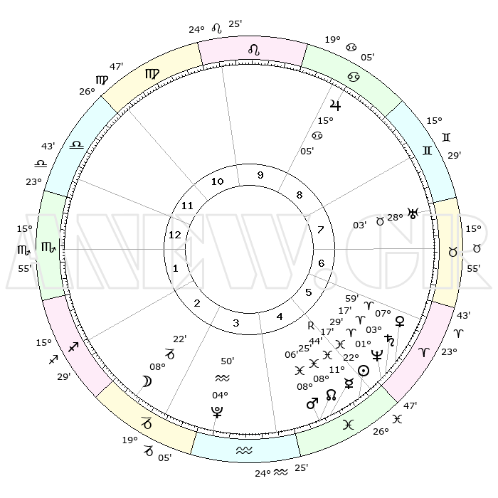 | | ΘΕΣΕΙΣ ΠΛΑΝΗΤΩΝ ΑΣΤΡΟΛΟΓΙΚΟΥ ΧΑΡΤΗ ΤΗΣ ΣΤΙΓΜΗΣ ΑΥΤΗΣ | | | | Πλανήτης | Ζώδιο | Μοίρες | Δεκαήμ. | Σε οίκο | Απόκλιση | | Ακμές των οίκων | | Ηλιος | Ιχθείς | 22°13' | Τρίτο | 5 | 03 S 05 | | 1ος | 23°44' | Ζυγός | | Σελήνη | Αιγόκερως | 07°26' | Πρώτο | 3 | 27 S 51 | | 2ος | 21°47' | Σκορπιός | | Ερμής | Ιχθείς | 11°48'R | Δεύτερο | 5 | 04 S 27 | | 3ος | 23°18' | Τοξότης | | Αφροδίτη | Κριός | 07°54' | Πρώτο | 6 | 02 N 07 | | 4ος | 27°06' | Αιγόκερως | | Αρης | Ιχθείς | 08°03' | Πρώτο | 5 | 09 S 34 | | 5ος | 00°03' | Ιχθείς | | Δίας | Καρκίνος | 15°05' | Δεύτερο | 9 | 22 N 56 | | 6ος | 29°14' | Ιχθείς | | Κρόνος | Κριός | 03°16' | Πρώτο | 6 | 00 S 39 | | 7ος | 23°44' | Κριός | | Ουρανός | Ταύρος | 28°03' | Τρίτο | 8 | 19 N 33 | | 8ος | 21°47' | Ταύρος | | Ποσειδώνας | Κριός | 01°29' | Πρώτο | 6 | 00 S 36 | | 9ος | 23°18' | Δίδυμοι | | Πλούτωνας | Υδροχόος | 04°50' | Πρώτο | 4 | 22 S 50 | | 10ος | 27°06' | Καρκίνος | | Β. Δεσμός | Ιχθείς | 08°25' | Πρώτο | 5 | 08 S 25 | | 11ος | 00°03' | Παρθένος | | Ωροσκόπος | Ζυγός | 23°44' | Τρίτο | | | 12ος | 29°14' | Παρθένος | | Μεσουράνημα | Καρκίνος | 27°06' | Τρίτο | | | |