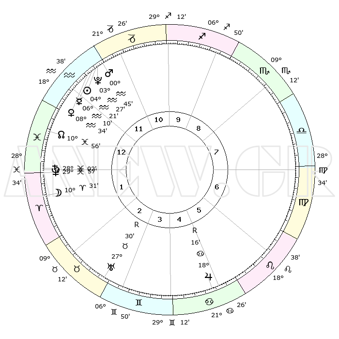 | | ΘΕΣΕΙΣ ΠΛΑΝΗΤΩΝ ΑΣΤΡΟΛΟΓΙΚΟΥ ΧΑΡΤΗ ΤΗΣ ΣΤΙΓΜΗΣ ΑΥΤΗΣ | | | | Πλανήτης | Ζώδιο | Μοίρες | Δεκαήμ. | Σε οίκο | Απόκλιση | | Ακμές των οίκων | | Ηλιος | Υδροχόος | 04°15' | Πρώτο | 12 | 19 S 11 | | 1ος | 09°28' | Υδροχόος | | Σελήνη | Κριός | 09°17' | Πρώτο | 2 | 06 N 04 | | 2ος | 24°48' | Ιχθείς | | Ερμής | Υδροχόος | 06°01' | Πρώτο | 12 | 20 S 47 | | 3ος | 01°35' | Ταύρος | | Αφροδίτη | Υδροχόος | 08°27' | Πρώτο | 12 | 19 S 19 | | 4ος | 28°31' | Ταύρος | | Αρης | Υδροχόος | 00°41' | Πρώτο | 12 | 20 S 59 | | 5ος | 20°43' | Δίδυμοι | | Δίας | Καρκίνος | 18°16'R | Δεύτερο | 6 | 22 N 28 | | 6ος | 12°35' | Καρκίνος | | Κρόνος | Ιχθείς | 28°02' | Τρίτο | 2 | 02 S 48 | | 7ος | 09°28' | Λέων | | Ουρανός | Ταύρος | 27°30'R | Τρίτο | 3 | 19 N 25 | | 8ος | 24°48' | Παρθένος | | Ποσειδώνας | Ιχθείς | 29°56' | Τρίτο | 2 | 01 S 14 | | 9ος | 01°35' | Σκορπιός | | Πλούτωνας | Υδροχόος | 03°27' | Πρώτο | 12 | 23 S 04 | | 10ος | 28°31' | Σκορπιός | | Β. Δεσμός | Ιχθείς | 10°56' | Δεύτερο | 1 | 07 S 28 | | 11ος | 20°43' | Τοξότης | | Ωροσκόπος | Υδροχόος | 09°28' | Πρώτο | | | 12ος | 12°35' | Αιγόκερως | | Μεσουράνημα | Σκορπιός | 28°31' | Τρίτο | | | |