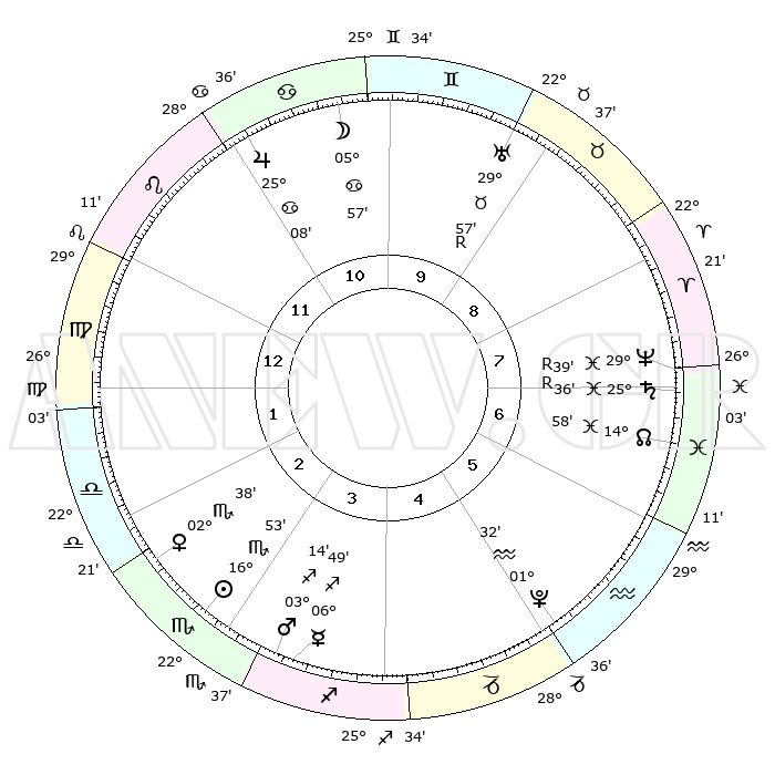 | | ΘΕΣΕΙΣ ΠΛΑΝΗΤΩΝ ΑΣΤΡΟΛΟΓΙΚΟΥ ΧΑΡΤΗ ΤΗΣ ΣΤΙΓΜΗΣ ΑΥΤΗΣ | | | | Πλανήτης | Ζώδιο | Μοίρες | Δεκαήμ. | Σε οίκο | Απόκλιση | | Ακμές των οίκων | | Ηλιος | Σκορπιός | 16°48' | Δεύτερο | 3 | 16 S 51 | | 1ος | 03°25' | Παρθένος | | Σελήνη | Καρκίνος | 04°49' | Πρώτο | 11 | 28 N 09 | | 2ος | 27°38' | Παρθένος | | Ερμής | Τοξότης | 06°49' | Πρώτο | 4 | 23 S 53 | | 3ος | 26°36' | Ζυγός | | Αφροδίτη | Σκορπιός | 02°32' | Πρώτο | 3 | 11 S 05 | | 4ος | 29°32' | Σκορπιός | | Αρης | Τοξότης | 03°11' | Πρώτο | 4 | 21 S 15 | | 5ος | 03°30' | Αιγόκερως | | Δίας | Καρκίνος | 25°08' | Τρίτο | 11 | 21 N 12 | | 6ος | 05°13' | Υδροχόος | | Κρόνος | Ιχθείς | 25°37'R | Τρίτο | 7 | 03 S 59 | | 7ος | 03°25' | Ιχθείς | | Ουρανός | Ταύρος | 29°58'R | Τρίτο | 10 | 19 N 56 | | 8ος | 27°38' | Ιχθείς | | Ποσειδώνας | Ιχθείς | 29°39'R | Τρίτο | 8 | 01 S 24 | | 9ος | 26°36' | Κριός | | Πλούτωνας | Υδροχόος | 01°32' | Πρώτο | 5 | 23 S 29 | | 10ος | 29°32' | Ταύρος | | Β. Δεσμός | Ιχθείς | 14°59' | Δεύτερο | 7 | 05 S 55 | | 11ος | 03°30' | Καρκίνος | | Ωροσκόπος | Παρθένος | 03°25' | Πρώτο | | | 12ος | 05°13' | Λέων | | Μεσουράνημα | Ταύρος | 29°32' | Τρίτο | | | |