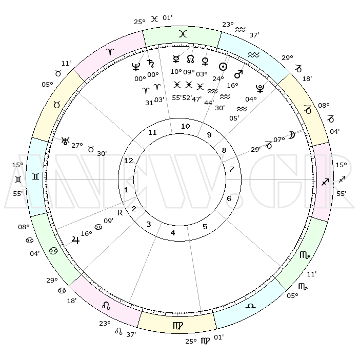 | | ΘΕΣΕΙΣ ΠΛΑΝΗΤΩΝ ΑΣΤΡΟΛΟΓΙΚΟΥ ΧΑΡΤΗ ΤΗΣ ΣΤΙΓΜΗΣ ΑΥΤΗΣ | | | | Πλανήτης | Ζώδιο | Μοίρες | Δεκαήμ. | Σε οίκο | Απόκλιση | | Ακμές των οίκων | | Ηλιος | Υδροχόος | 24°40' | Τρίτο | 10 | 13 S 18 | | 1ος | 16°49' | Ταύρος | | Σελήνη | Αιγόκερως | 06°38' | Πρώτο | 8 | 27 S 55 | | 2ος | 14°36' | Δίδυμοι | | Ερμής | Ιχθείς | 10°49' | Δεύτερο | 11 | 07 S 47 | | 3ος | 06°43' | Καρκίνος | | Αφροδίτη | Ιχθείς | 03°42' | Πρώτο | 11 | 11 S 31 | | 4ος | 28°45' | Καρκίνος | | Αρης | Υδροχόος | 16°27' | Δεύτερο | 10 | 16 S 56 | | 5ος | 25°09' | Λέων | | Δίας | Καρκίνος | 16°09'R | Δεύτερο | 3 | 22 N 47 | | 6ος | 01°13' | Ζυγός | | Κρόνος | Κριός | 00°03' | Πρώτο | 11 | 01 S 57 | | 7ος | 16°49' | Σκορπιός | | Ουρανός | Ταύρος | 27°30' | Τρίτο | 1 | 19 N 25 | | 8ος | 14°36' | Τοξότης | | Ποσειδώνας | Κριός | 00°31' | Πρώτο | 11 | 01 S 00 | | 9ος | 06°43' | Αιγόκερως | | Πλούτωνας | Υδροχόος | 04°05' | Πρώτο | 10 | 22 S 57 | | 10ος | 28°45' | Αιγόκερως | | Β. Δεσμός | Ιχθείς | 09°52' | Πρώτο | 11 | 07 S 52 | | 11ος | 25°09' | Υδροχόος | | Ωροσκόπος | Ταύρος | 16°49' | Δεύτερο | | | 12ος | 01°13' | Κριός | | Μεσουράνημα | Αιγόκερως | 28°45' | Τρίτο | | | |