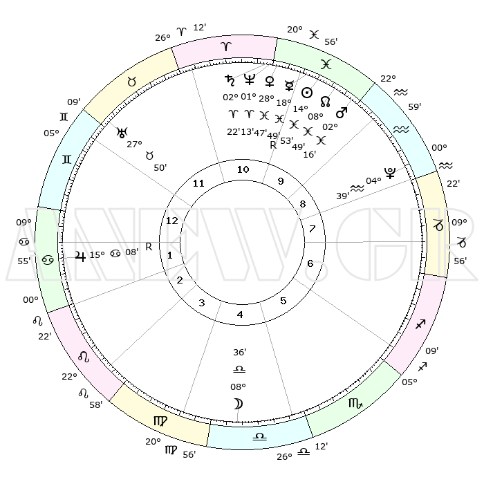 | | ΘΕΣΕΙΣ ΠΛΑΝΗΤΩΝ ΑΣΤΡΟΛΟΓΙΚΟΥ ΧΑΡΤΗ ΤΗΣ ΣΤΙΓΜΗΣ ΑΥΤΗΣ | | | | Πλανήτης | Ζώδιο | Μοίρες | Δεκαήμ. | Σε οίκο | Απόκλιση | | Ακμές των οίκων | | Ηλιος | Ιχθείς | 14°49' | Δεύτερο | 10 | 05 S 59 | | 1ος | 16°36' | Δίδυμοι | | Σελήνη | Ζυγός | 07°42' | Πρώτο | 5 | 05 S 23 | | 2ος | 08°39' | Καρκίνος | | Ερμής | Ιχθείς | 18°53'R | Δεύτερο | 10 | 01 S 00 | | 3ος | 29°54' | Καρκίνος | | Αφροδίτη | Ιχθείς | 28°41' | Τρίτο | 11 | 01 S 42 | | 4ος | 24°18' | Λέων | | Αρης | Ιχθείς | 02°13' | Πρώτο | 10 | 11 S 42 | | 5ος | 25°50' | Παρθένος | | Δίας | Καρκίνος | 15°08'R | Δεύτερο | 2 | 22 N 55 | | 6ος | 06°02' | Σκορπιός | | Κρόνος | Κριός | 02°22' | Πρώτο | 11 | 01 S 01 | | 7ος | 16°36' | Τοξότης | | Ουρανός | Ταύρος | 27°50' | Τρίτο | 12 | 19 N 30 | | 8ος | 08°39' | Αιγόκερως | | Ποσειδώνας | Κριός | 01°13' | Πρώτο | 11 | 00 S 43 | | 9ος | 29°54' | Αιγόκερως | | Πλούτωνας | Υδροχόος | 04°39' | Πρώτο | 9 | 22 S 51 | | 10ος | 24°18' | Υδροχόος | | Β. Δεσμός | Ιχθείς | 08°49' | Πρώτο | 10 | 08 S 16 | | 11ος | 25°50' | Ιχθείς | | Ωροσκόπος | Δίδυμοι | 16°36' | Δεύτερο | | | 12ος | 06°02' | Ταύρος | | Μεσουράνημα | Υδροχόος | 24°18' | Τρίτο | | | |