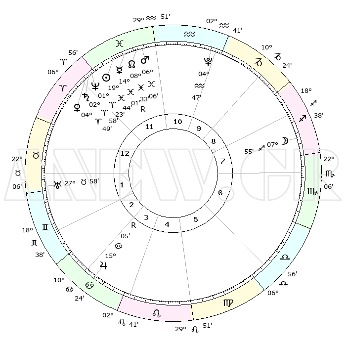 | | ΘΕΣΕΙΣ ΠΛΑΝΗΤΩΝ ΑΣΤΡΟΛΟΓΙΚΟΥ ΧΑΡΤΗ ΤΗΣ ΣΤΙΓΜΗΣ ΑΥΤΗΣ | | | | Πλανήτης | Ζώδιο | Μοίρες | Δεκαήμ. | Σε οίκο | Απόκλιση | | Ακμές των οίκων | | Ηλιος | Ιχθείς | 19°41' | Δεύτερο | 12 | 04 S 05 | | 1ος | 25°03' | Κριός | | Σελήνη | Τοξότης | 07°17' | Πρώτο | 8 | 26 S 43 | | 2ος | 28°39' | Ταύρος | | Ερμής | Ιχθείς | 14°04'R | Δεύτερο | 12 | 03 S 11 | | 3ος | 22°44' | Δίδυμοι | | Αφροδίτη | Κριός | 04°45' | Πρώτο | 12 | 00 N 49 | | 4ος | 14°25' | Καρκίνος | | Αρης | Ιχθείς | 06°03' | Πρώτο | 11 | 10 S 18 | | 5ος | 08°21' | Λέων | | Δίας | Καρκίνος | 15°05'R | Δεύτερο | 4 | 22 N 56 | | 6ος | 10°06' | Παρθένος | | Κρόνος | Κριός | 02°58' | Πρώτο | 12 | 00 S 47 | | 7ος | 25°03' | Ζυγός | | Ουρανός | Ταύρος | 27°58' | Τρίτο | 1 | 19 N 32 | | 8ος | 28°39' | Σκορπιός | | Ποσειδώνας | Κριός | 01°23' | Πρώτο | 12 | 00 S 39 | | 9ος | 22°44' | Τοξότης | | Πλούτωνας | Υδροχόος | 04°46' | Πρώτο | 10 | 22 S 50 | | 10ος | 14°25' | Αιγόκερως | | Β. Δεσμός | Ιχθείς | 08°33' | Πρώτο | 11 | 08 S 22 | | 11ος | 08°21' | Υδροχόος | | Ωροσκόπος | Κριός | 25°03' | Τρίτο | | | 12ος | 10°06' | Ιχθείς | | Μεσουράνημα | Αιγόκερως | 14°25' | Δεύτερο | | | |