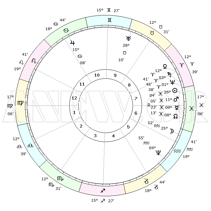 | | ΘΕΣΕΙΣ ΠΛΑΝΗΤΩΝ ΑΣΤΡΟΛΟΓΙΚΟΥ ΧΑΡΤΗ ΤΗΣ ΣΤΙΓΜΗΣ ΑΥΤΗΣ | | | | Πλανήτης | Ζώδιο | Μοίρες | Δεκαήμ. | Σε οίκο | Απόκλιση | | Ακμές των οίκων | | Ηλιος | Ιχθείς | 26°01' | Τρίτο | 8 | 01 S 35 | | 1ος | 29°50' | Λέων | | Σελήνη | Υδροχόος | 25°05' | Τρίτο | 6 | 14 S 21 | | 2ος | 23°40' | Παρθένος | | Ερμής | Ιχθείς | 09°24'R | Πρώτο | 7 | 06 S 09 | | 3ος | 22°20' | Ζυγός | | Αφροδίτη | Κριός | 12°37' | Δεύτερο | 8 | 04 N 04 | | 4ος | 25°15' | Σκορπιός | | Αρης | Ιχθείς | 11°02' | Δεύτερο | 7 | 08 S 26 | | 5ος | 29°27' | Τοξότης | | Δίας | Καρκίνος | 15°08' | Δεύτερο | 11 | 22 N 56 | | 6ος | 01°25' | Υδροχόος | | Κρόνος | Κριός | 03°45' | Πρώτο | 8 | 00 S 28 | | 7ος | 29°50' | Υδροχόος | | Ουρανός | Ταύρος | 28°10' | Τρίτο | 10 | 19 N 35 | | 8ος | 23°40' | Ιχθείς | | Ποσειδώνας | Κριός | 01°38' | Πρώτο | 8 | 00 S 33 | | 9ος | 22°20' | Κριός | | Πλούτωνας | Υδροχόος | 04°55' | Πρώτο | 6 | 22 S 49 | | 10ος | 25°15' | Ταύρος | | Β. Δεσμός | Ιχθείς | 08°13' | Πρώτο | 7 | 08 S 29 | | 11ος | 29°27' | Δίδυμοι | | Ωροσκόπος | Λέων | 29°50' | Τρίτο | | | 12ος | 01°25' | Λέων | | Μεσουράνημα | Ταύρος | 25°15' | Τρίτο | | | |