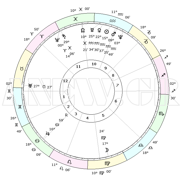 | | ΘΕΣΕΙΣ ΠΛΑΝΗΤΩΝ ΑΣΤΡΟΛΟΓΙΚΟΥ ΧΑΡΤΗ ΤΗΣ ΣΤΙΓΜΗΣ ΑΥΤΗΣ | | | | Πλανήτης | Ζώδιο | Μοίρες | Δεκαήμ. | Σε οίκο | Απόκλιση | | Ακμές των οίκων | | Ηλιος | Υδροχόος | 15°32' | Δεύτερο | 11 | 16 S 11 | | 1ος | 24°01' | Κριός | | Σελήνη | Παρθένος | 16°21' | Δεύτερο | 6 | 04 N 46 | | 2ος | 27°54' | Ταύρος | | Ερμής | Υδροχόος | 25°25' | Τρίτο | 11 | 14 S 34 | | 3ος | 22°06' | Δίδυμοι | | Αφροδίτη | Υδροχόος | 22°24' | Τρίτο | 11 | 15 S 22 | | 4ος | 13°48' | Καρκίνος | | Αρης | Υδροχόος | 09°22' | Πρώτο | 11 | 18 S 55 | | 5ος | 07°38' | Λέων | | Δίας | Καρκίνος | 16°60'R | Δεύτερο | 4 | 22 N 40 | | 6ος | 09°12' | Παρθένος | | Κρόνος | Ιχθείς | 29°06' | Τρίτο | 12 | 02 S 21 | | 7ος | 24°01' | Ζυγός | | Ουρανός | Ταύρος | 27°27' | Τρίτο | 1 | 19 N 24 | | 8ος | 27°54' | Σκορπιός | | Ποσειδώνας | Κριός | 00°14' | Πρώτο | 12 | 01 S 07 | | 9ος | 22°06' | Τοξότης | | Πλούτωνας | Υδροχόος | 03°48' | Πρώτο | 10 | 23 S 00 | | 10ος | 13°48' | Αιγόκερως | | Β. Δεσμός | Ιχθείς | 10°21' | Δεύτερο | 12 | 07 S 41 | | 11ος | 07°38' | Υδροχόος | | Ωροσκόπος | Κριός | 24°01' | Τρίτο | | | 12ος | 09°12' | Ιχθείς | | Μεσουράνημα | Αιγόκερως | 13°48' | Δεύτερο | | | |