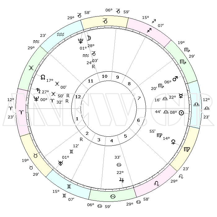 | ΘΕΣΕΙΣ ΠΛΑΝΗΤΩΝ ΑΣΤΡΟΛΟΓΙΚΟΥ ΧΑΡΤΗ ΤΗΣ ΣΤΙΓΜΗΣ ΑΥΤΗΣ | | Πλανήτης | Ζώδιο | Μοίρες | Δεκαήμ. | Σε οίκο | Απόκλιση | | Ακμές των οίκων | Ηλιος | Ζυγός | 08°39' | Πρώτο | 7 | 03 S 26 | | 1ος | 24°04' | Υδροχόος | Σελήνη | Αιγόκερως | 26°59' | Τρίτο | 12 | 24 S 47 | | 2ος | 09°49' | Κριός | Ερμής | Ζυγός | 22°08' | Τρίτο | 8 | 08 S 47 | | 3ος | 13°43' | Ταύρος | Αφροδίτη | Παρθένος | 14°48' | Δεύτερο | 7 | 07 N 11 | | 4ος | 08°45' | Δίδυμοι | Αρης | Σκορπιός | 06°17' | Πρώτο | 8 | 13 S 41 | | 5ος | 00°29' | Καρκίνος | Δίας | Καρκίνος | 22°32' | Τρίτο | 5 | 21 N 34 | | 6ος | 23°28' | Καρκίνος | Κρόνος | Ιχθείς | 27°51'R | Τρίτο | 1 | 03 S 10 | | 7ος | 24°04' | Λέων | Ουρανός | Δίδυμοι | 01°12'R | Πρώτο | 3 | 20 N 11 | | 8ος | 09°49' | Ζυγός | Ποσειδώνας | Κριός | 00°32'R | Πρώτο | 1 | 01 S 03 | | 9ος | 13°43' | Σκορπιός | Πλούτωνας | Υδροχόος | 01°24'R | Πρώτο | 12 | 23 S 32 | | 10ος | 08°45' | Τοξότης | Β. Δεσμός | Ιχθείς | 17°01' | Δεύτερο | 1 | 05 S 08 | | 11ος | 00°29' | Αιγόκερως | Ωροσκόπος | Υδροχόος | 24°04' | Τρίτο | | | 12ος | 23°28' | Αιγόκερως | Μεσουράνημα | Τοξότης | 08°45' | Πρώτο | | | |