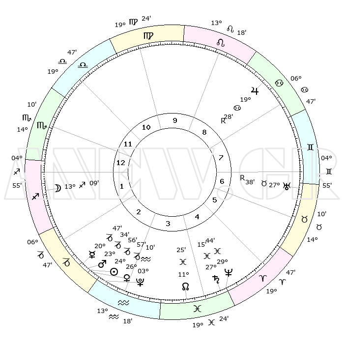 | | ΘΕΣΕΙΣ ΠΛΑΝΗΤΩΝ ΑΣΤΡΟΛΟΓΙΚΟΥ ΧΑΡΤΗ ΤΗΣ ΣΤΙΓΜΗΣ ΑΥΤΗΣ | | | | Πλανήτης | Ζώδιο | Μοίρες | Δεκαήμ. | Σε οίκο | Απόκλιση | | Ακμές των οίκων | | Ηλιος | Αιγόκερως | 24°51' | Τρίτο | 3 | 21 S 09 | | 1ος | 13°29' | Σκορπιός | | Σελήνη | Τοξότης | 12°17' | Δεύτερο | 1 | 27 S 20 | | 2ος | 12°50' | Τοξότης | | Ερμής | Αιγόκερως | 20°40' | Τρίτο | 3 | 23 S 36 | | 3ος | 16°08' | Αιγόκερως | | Αφροδίτη | Αιγόκερως | 26°51' | Τρίτο | 3 | 21 S 45 | | 4ος | 21°18' | Υδροχόος | | Αρης | Αιγόκερως | 23°30' | Τρίτο | 3 | 22 S 21 | | 5ος | 23°49' | Ιχθείς | | Δίας | Καρκίνος | 19°29'R | Δεύτερο | 9 | 22 N 17 | | 6ος | 21°02' | Κριός | | Κρόνος | Ιχθείς | 27°15' | Τρίτο | 5 | 03 S 08 | | 7ος | 13°29' | Ταύρος | | Ουρανός | Ταύρος | 27°38'R | Τρίτο | 7 | 19 N 26 | | 8ος | 12°50' | Δίδυμοι | | Ποσειδώνας | Ιχθείς | 29°44' | Τρίτο | 5 | 01 S 19 | | 9ος | 16°08' | Καρκίνος | | Πλούτωνας | Υδροχόος | 03°09' | Πρώτο | 3 | 23 S 08 | | 10ος | 21°18' | Λέων | | Β. Δεσμός | Ιχθείς | 11°26' | Δεύτερο | 4 | 07 S 17 | | 11ος | 23°49' | Παρθένος | | Ωροσκόπος | Σκορπιός | 13°29' | Δεύτερο | | | 12ος | 21°02' | Ζυγός | | Μεσουράνημα | Λέων | 21°18' | Τρίτο | | | |