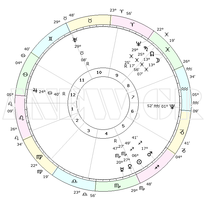 | | ΘΕΣΕΙΣ ΠΛΑΝΗΤΩΝ ΑΣΤΡΟΛΟΓΙΚΟΥ ΧΑΡΤΗ ΤΗΣ ΣΤΙΓΜΗΣ ΑΥΤΗΣ | | | | Πλανήτης | Ζώδιο | Μοίρες | Δεκαήμ. | Σε οίκο | Απόκλιση | | Ακμές των οίκων | | Ηλιος | Τοξότης | 06°48' | Πρώτο | 5 | 21 S 26 | | 1ος | 28°03' | Καρκίνος | | Σελήνη | Ιχθείς | 12°47' | Δεύτερο | 8 | 06 S 53 | | 2ος | 18°58' | Λέων | | Ερμής | Σκορπιός | 20°47'R | Τρίτο | 5 | 15 S 34 | | 3ος | 13°45' | Παρθένος | | Αφροδίτη | Σκορπιός | 27°25' | Τρίτο | 5 | 18 S 49 | | 4ος | 14°32' | Ζυγός | | Αρης | Τοξότης | 17°40' | Δεύτερο | 5 | 23 S 30 | | 5ος | 20°37' | Σκορπιός | | Δίας | Καρκίνος | 24°40'R | Τρίτο | 12 | 21 N 20 | | 6ος | 26°39' | Τοξότης | | Κρόνος | Ιχθείς | 25°17' | Τρίτο | 9 | 04 S 03 | | 7ος | 28°03' | Αιγόκερως | | Ουρανός | Ταύρος | 29°08'R | Τρίτο | 11 | 19 N 46 | | 8ος | 18°58' | Υδροχόος | | Ποσειδώνας | Ιχθείς | 29°25'R | Τρίτο | 9 | 01 S 29 | | 9ος | 13°45' | Ιχθείς | | Πλούτωνας | Υδροχόος | 01°51' | Πρώτο | 7 | 23 S 25 | | 10ος | 14°32' | Κριός | | Β. Δεσμός | Ιχθείς | 13°56' | Δεύτερο | 9 | 06 S 19 | | 11ος | 20°37' | Ταύρος | | Ωροσκόπος | Καρκίνος | 28°03' | Τρίτο | | | 12ος | 26°39' | Δίδυμοι | | Μεσουράνημα | Κριός | 14°32' | Δεύτερο | | | |