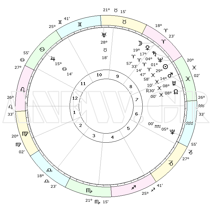 | | ΘΕΣΕΙΣ ΠΛΑΝΗΤΩΝ ΑΣΤΡΟΛΟΓΙΚΟΥ ΧΑΡΤΗ ΤΗΣ ΣΤΙΓΜΗΣ ΑΥΤΗΣ | | | | Πλανήτης | Ζώδιο | Μοίρες | Δεκαήμ. | Σε οίκο | Απόκλιση | | Ακμές των οίκων | | Ηλιος | Ιχθείς | 29°54' | Τρίτο | 9 | 00 S 03 | | 1ος | 05°13' | Λέων | | Σελήνη | Κριός | 18°53' | Δεύτερο | 9 | 10 N 31 | | 2ος | 26°39' | Λέων | | Ερμής | Ιχθείς | 08°30'R | Πρώτο | 8 | 07 S 24 | | 3ος | 22°24' | Παρθένος | | Αφροδίτη | Κριός | 17°27' | Δεύτερο | 9 | 06 N 03 | | 4ος | 24°02' | Ζυγός | | Αρης | Ιχθείς | 14°07' | Δεύτερο | 8 | 07 S 15 | | 5ος | 29°53' | Σκορπιός | | Δίας | Καρκίνος | 15°14' | Δεύτερο | 12 | 22 N 55 | | 6ος | 04°45' | Αιγόκερως | | Κρόνος | Κριός | 04°14' | Πρώτο | 9 | 00 S 16 | | 7ος | 05°13' | Υδροχόος | | Ουρανός | Ταύρος | 28°18' | Τρίτο | 10 | 19 N 36 | | 8ος | 26°39' | Υδροχόος | | Ποσειδώνας | Κριός | 01°47' | Πρώτο | 9 | 00 S 30 | | 9ος | 22°24' | Ιχθείς | | Πλούτωνας | Υδροχόος | 05°00' | Πρώτο | 6 | 22 S 49 | | 10ος | 24°02' | Κριός | | Β. Δεσμός | Ιχθείς | 08°01' | Πρώτο | 8 | 08 S 34 | | 11ος | 29°53' | Ταύρος | | Ωροσκόπος | Λέων | 05°13' | Πρώτο | | | 12ος | 04°45' | Καρκίνος | | Μεσουράνημα | Κριός | 24°02' | Τρίτο | | | |