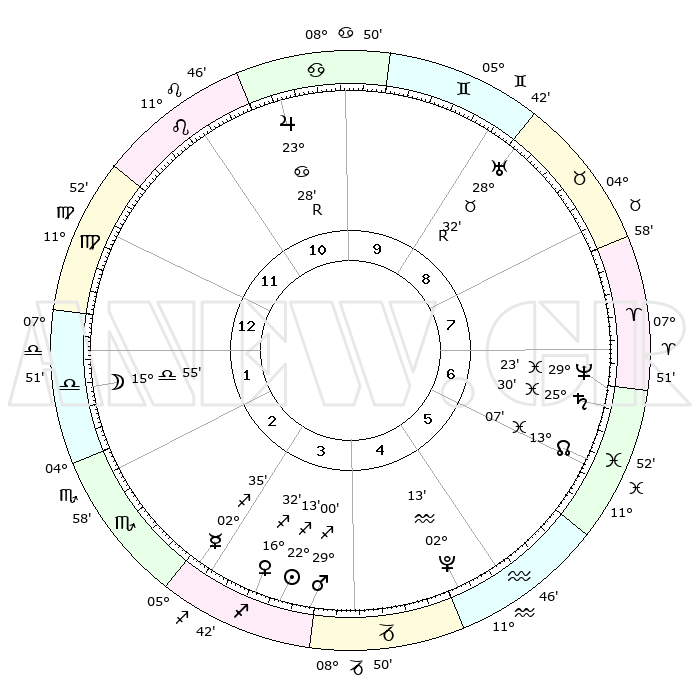 | | ΘΕΣΕΙΣ ΠΛΑΝΗΤΩΝ ΑΣΤΡΟΛΟΓΙΚΟΥ ΧΑΡΤΗ ΤΗΣ ΣΤΙΓΜΗΣ ΑΥΤΗΣ | | | | Πλανήτης | Ζώδιο | Μοίρες | Δεκαήμ. | Σε οίκο | Απόκλιση | | Ακμές των οίκων | | Ηλιος | Τοξότης | 22°06' | Τρίτο | 4 | 23 S 12 | | 1ος | 05°10' | Παρθένος | | Σελήνη | Ζυγός | 14°35' | Δεύτερο | 2 | 08 S 10 | | 2ος | 29°33' | Παρθένος | | Ερμής | Τοξότης | 02°27' | Πρώτο | 4 | 19 S 00 | | 3ος | 28°40' | Ζυγός | | Αφροδίτη | Τοξότης | 16°24' | Δεύτερο | 4 | 22 S 32 | | 4ος | 01°37' | Τοξότης | | Αρης | Τοξότης | 28°55' | Τρίτο | 4 | 24 S 12 | | 5ος | 05°28' | Αιγόκερως | | Δίας | Καρκίνος | 23°29'R | Τρίτο | 11 | 21 N 35 | | 6ος | 07°03' | Υδροχόος | | Κρόνος | Ιχθείς | 25°30' | Τρίτο | 7 | 03 S 55 | | 7ος | 05°10' | Ιχθείς | | Ουρανός | Ταύρος | 28°32'R | Τρίτο | 9 | 19 N 38 | | 8ος | 29°33' | Ιχθείς | | Ποσειδώνας | Ιχθείς | 29°23' | Τρίτο | 7 | 01 S 29 | | 9ος | 28°40' | Κριός | | Πλούτωνας | Υδροχόος | 02°13' | Πρώτο | 5 | 23 S 20 | | 10ος | 01°37' | Δίδυμοι | | Β. Δεσμός | Ιχθείς | 13°08' | Δεύτερο | 7 | 06 S 38 | | 11ος | 05°28' | Καρκίνος | | Ωροσκόπος | Παρθένος | 05°10' | Πρώτο | | | 12ος | 07°03' | Λέων | | Μεσουράνημα | Δίδυμοι | 01°37' | Πρώτο | | | |