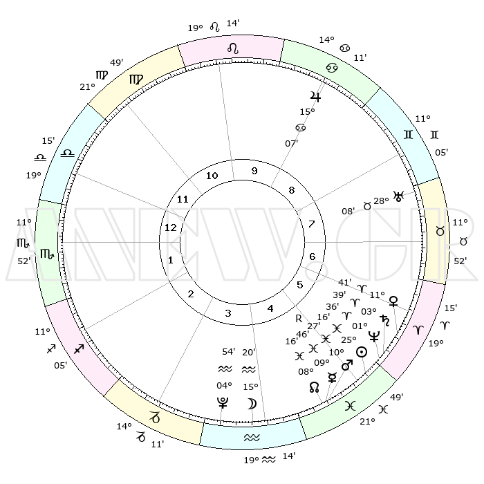 | | ΘΕΣΕΙΣ ΠΛΑΝΗΤΩΝ ΑΣΤΡΟΛΟΓΙΚΟΥ ΧΑΡΤΗ ΤΗΣ ΣΤΙΓΜΗΣ ΑΥΤΗΣ | | | | Πλανήτης | Ζώδιο | Μοίρες | Δεκαήμ. | Σε οίκο | Απόκλιση | | Ακμές των οίκων | | Ηλιος | Ιχθείς | 25°13' | Τρίτο | 5 | 01 S 54 | | 1ος | 26°44' | Ζυγός | | Σελήνη | Υδροχόος | 14°40' | Δεύτερο | 4 | 18 S 31 | | 2ος | 24°58' | Σκορπιός | | Ερμής | Ιχθείς | 09°48'R | Πρώτο | 5 | 05 S 50 | | 3ος | 26°40' | Τοξότης | | Αφροδίτη | Κριός | 11°37' | Δεύτερο | 6 | 03 N 39 | | 4ος | 00°39' | Υδροχόος | | Αρης | Ιχθείς | 10°24' | Δεύτερο | 5 | 08 S 40 | | 5ος | 03°36' | Ιχθείς | | Δίας | Καρκίνος | 15°07' | Δεύτερο | 9 | 22 N 56 | | 6ος | 02°33' | Κριός | | Κρόνος | Κριός | 03°39' | Πρώτο | 6 | 00 S 30 | | 7ος | 26°44' | Κριός | | Ουρανός | Ταύρος | 28°08' | Τρίτο | 8 | 19 N 34 | | 8ος | 24°58' | Ταύρος | | Ποσειδώνας | Κριός | 01°36' | Πρώτο | 5 | 00 S 34 | | 9ος | 26°40' | Δίδυμοι | | Πλούτωνας | Υδροχόος | 04°54' | Πρώτο | 4 | 22 S 49 | | 10ος | 00°39' | Λέων | | Β. Δεσμός | Ιχθείς | 08°16' | Πρώτο | 5 | 08 S 28 | | 11ος | 03°36' | Παρθένος | | Ωροσκόπος | Ζυγός | 26°44' | Τρίτο | | | 12ος | 02°33' | Ζυγός | | Μεσουράνημα | Λέων | 00°39' | Πρώτο | | | |