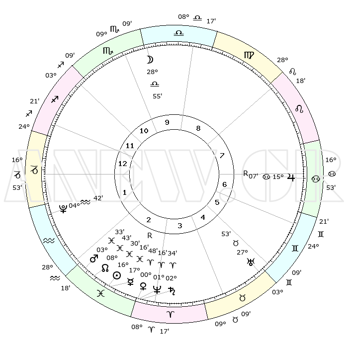 | | ΘΕΣΕΙΣ ΠΛΑΝΗΤΩΝ ΑΣΤΡΟΛΟΓΙΚΟΥ ΧΑΡΤΗ ΤΗΣ ΣΤΙΓΜΗΣ ΑΥΤΗΣ | | | | Πλανήτης | Ζώδιο | Μοίρες | Δεκαήμ. | Σε οίκο | Απόκλιση | | Ακμές των οίκων | | Ηλιος | Ιχθείς | 16°22' | Δεύτερο | 3 | 05 S 23 | | 1ος | 02°46' | Τοξότης | | Σελήνη | Ζυγός | 27°14' | Τρίτο | 11 | 14 S 09 | | 2ος | 04°18' | Αιγόκερως | | Ερμής | Ιχθείς | 17°24'R | Δεύτερο | 4 | 01 S 36 | | 3ος | 10°28' | Υδροχόος | | Αφροδίτη | Κριός | 00°38' | Πρώτο | 4 | 00 S 54 | | 4ος | 16°34' | Ιχθείς | | Αρης | Ιχθείς | 03°26' | Πρώτο | 3 | 11 S 16 | | 5ος | 17°14' | Κριός | | Δίας | Καρκίνος | 15°07'R | Δεύτερο | 8 | 22 N 56 | | 6ος | 11°54' | Ταύρος | | Κρόνος | Κριός | 02°33' | Πρώτο | 4 | 00 S 56 | | 7ος | 02°46' | Δίδυμοι | | Ουρανός | Ταύρος | 27°53' | Τρίτο | 6 | 19 N 30 | | 8ος | 04°18' | Καρκίνος | | Ποσειδώνας | Κριός | 01°16' | Πρώτο | 4 | 00 S 42 | | 9ος | 10°28' | Λέων | | Πλούτωνας | Υδροχόος | 04°42' | Πρώτο | 2 | 22 S 51 | | 10ος | 16°34' | Παρθένος | | Β. Δεσμός | Ιχθείς | 08°44' | Πρώτο | 3 | 08 S 18 | | 11ος | 17°14' | Ζυγός | | Ωροσκόπος | Τοξότης | 02°46' | Πρώτο | | | 12ος | 11°54' | Σκορπιός | | Μεσουράνημα | Παρθένος | 16°34' | Δεύτερο | | | |