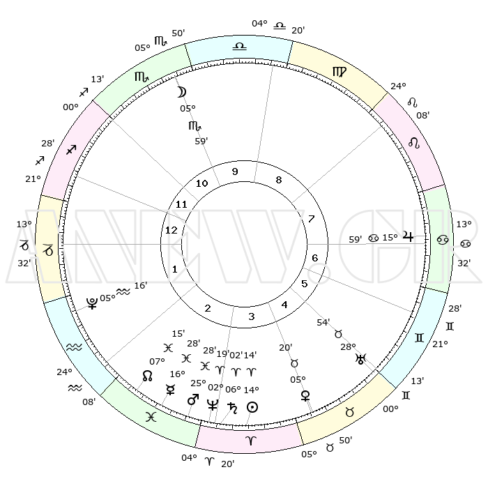 | | ΘΕΣΕΙΣ ΠΛΑΝΗΤΩΝ ΑΣΤΡΟΛΟΓΙΚΟΥ ΧΑΡΤΗ ΤΗΣ ΣΤΙΓΜΗΣ ΑΥΤΗΣ | | | | Πλανήτης | Ζώδιο | Μοίρες | Δεκαήμ. | Σε οίκο | Απόκλιση | | Ακμές των οίκων | | Ηλιος | Κριός | 14°11' | Δεύτερο | 4 | 05 N 35 | | 1ος | 23°28' | Τοξότης | | Σελήνη | Σκορπιός | 05°15' | Πρώτο | 10 | 17 S 21 | | 2ος | 29°02' | Αιγόκερως | | Ερμής | Ιχθείς | 16°24' | Δεύτερο | 3 | 06 S 57 | | 3ος | 08°24' | Ιχθείς | | Αφροδίτη | Ταύρος | 05°16' | Πρώτο | 4 | 12 N 58 | | 4ος | 13°17' | Κριός | | Αρης | Ιχθείς | 25°25' | Τρίτο | 3 | 02 S 46 | | 5ος | 10°40' | Ταύρος | | Δίας | Καρκίνος | 15°59' | Δεύτερο | 7 | 22 N 51 | | 6ος | 02°58' | Δίδυμοι | | Κρόνος | Κριός | 06°02' | Πρώτο | 3 | 00 N 26 | | 7ος | 23°28' | Δίδυμοι | | Ουρανός | Ταύρος | 28°54' | Τρίτο | 5 | 19 N 44 | | 8ος | 29°02' | Καρκίνος | | Ποσειδώνας | Κριός | 02°19' | Πρώτο | 3 | 00 S 17 | | 9ος | 08°24' | Παρθένος | | Πλούτωνας | Υδροχόος | 05°16' | Πρώτο | 2 | 22 S 47 | | 10ος | 13°17' | Ζυγός | | Β. Δεσμός | Ιχθείς | 07°15' | Πρώτο | 2 | 08 S 51 | | 11ος | 10°40' | Σκορπιός | | Ωροσκόπος | Τοξότης | 23°28' | Τρίτο | | | 12ος | 02°58' | Τοξότης | | Μεσουράνημα | Ζυγός | 13°17' | Δεύτερο | | | |