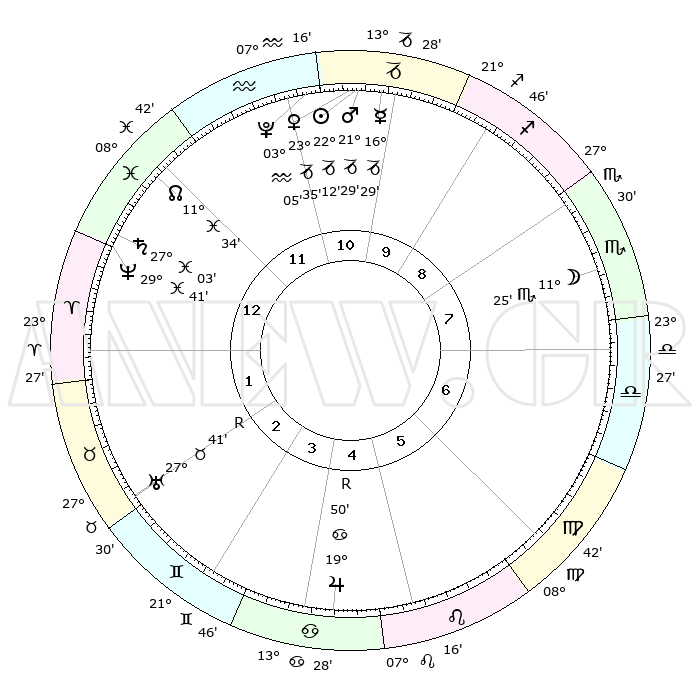 | | ΘΕΣΕΙΣ ΠΛΑΝΗΤΩΝ ΑΣΤΡΟΛΟΓΙΚΟΥ ΧΑΡΤΗ ΤΗΣ ΣΤΙΓΜΗΣ ΑΥΤΗΣ | | | | Πλανήτης | Ζώδιο | Μοίρες | Δεκαήμ. | Σε οίκο | Απόκλιση | | Ακμές των οίκων | | Ηλιος | Αιγόκερως | 22°08' | Τρίτο | 11 | 21 S 37 | | 1ος | 15°53' | Ιχθείς | | Σελήνη | Σκορπιός | 10°39' | Δεύτερο | 8 | 19 S 15 | | 2ος | 29°12' | Κριός | | Ερμής | Αιγόκερως | 16°23' | Δεύτερο | 11 | 24 S 02 | | 3ος | 28°56' | Ταύρος | | Αφροδίτη | Αιγόκερως | 23°30' | Τρίτο | 11 | 22 S 16 | | 4ος | 22°01' | Δίδυμοι | | Αρης | Αιγόκερως | 21°26' | Τρίτο | 11 | 22 S 40 | | 5ος | 13°51' | Καρκίνος | | Δίας | Καρκίνος | 19°50'R | Δεύτερο | 5 | 22 N 14 | | 6ος | 09°15' | Λέων | | Κρόνος | Ιχθείς | 27°03' | Τρίτο | 1 | 03 S 13 | | 7ος | 15°53' | Παρθένος | | Ουρανός | Ταύρος | 27°41'R | Τρίτο | 2 | 19 N 27 | | 8ος | 29°12' | Ζυγός | | Ποσειδώνας | Ιχθείς | 29°41' | Τρίτο | 1 | 01 S 21 | | 9ος | 28°56' | Σκορπιός | | Πλούτωνας | Υδροχόος | 03°04' | Πρώτο | 11 | 23 S 09 | | 10ος | 22°01' | Τοξότης | | Β. Δεσμός | Ιχθείς | 11°34' | Δεύτερο | 12 | 07 S 13 | | 11ος | 13°51' | Αιγόκερως | | Ωροσκόπος | Ιχθείς | 15°53' | Δεύτερο | | | 12ος | 09°15' | Υδροχόος | | Μεσουράνημα | Τοξότης | 22°01' | Τρίτο | | | |